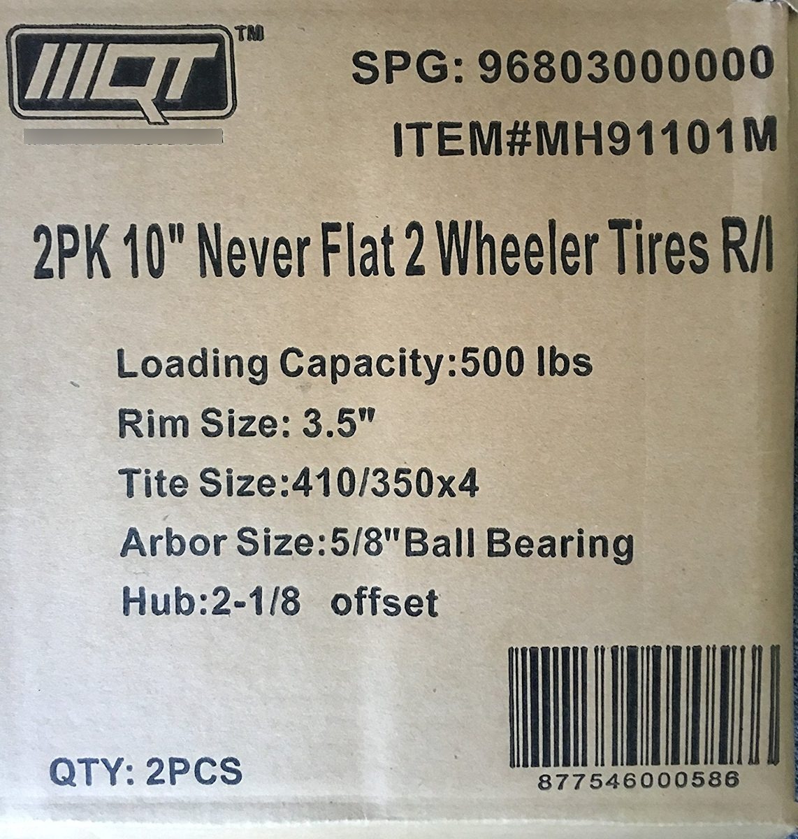 Nuevo par de neumáticos de 500 libras no planas, carro de mano / de uso múltiple utilidad de neumático en la rueda Características de 4,10 / 3,50 a 4″ con un 2 1/8″ eje de desplazamiento y 5/8″ rodamientos de bolas. Este conjunto de neumático y rueda es de uso general en compresores de aire, de mano camiones (carretillas), generadores, lavadoras a presión y otros equipos de servicios públicos. Tiene la misma sensación y el manejo de un neumático lleno de aire, pero garantiza que nunca se vaya plana. Cuenta con una capacidad de carga de 500 libras y una buena banda de rodamiento para el equilibrio perfecto de tracción y maniobrabilidad. Adicional Filtrado Todos nuestros productos estan en inglés SKU 11111753506