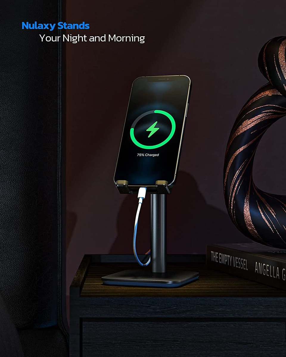 Por qué el soporte Nulaxy para teléfono Funciona como un elevador para elevar la pantalla de tu teléfono al nivel de los ojos. Puedes elevar la altura de 6.3 a 9 pulgadas, para proporcionarte el nivel de altura más cómodo y protegerte del dolor de cuello y espalda. Es compatible con manos libres y es un gran accesorio de escritorio para tu oficina y hogar.; Ángulo ajustable: el ángulo de la placa de soporte se puede ajustar fácilmente de 10 a 45, lo que proporciona un ángulo de visión cómodo para ti.; Ultra estable: la varilla está construida con aleación de aluminio de alta calidad, y una base de metal pesada proporciona una ultra estabilidad. Es duradero y resistente para apoyar tu teléfono todo el tiempo.; Diseño antideslizante y fácil de usar: la placa y la base totalmente de goma pueden proteger tu dispositivo de cualquier arañazo y deslizamiento. La tapa de carga reservada permite cargar el teléfono con un cable de carga. Funciona como una base de carga perfecta para tu teléfono. Esta almohadilla de teléfono no cubrirá el subtítulo cuando veas vídeos.; Compatibilidad universal: este soporte para teléfono celular puede funcionar con iPhone 12/12 Pro/12 Pro Max/12 Mini/iPhone 11/11 Pro/Max/X/MAX/XR/8/8P/7/7P/6/6P Note 10/9/8/Plus, S10/S9/S8, interruptor, todos los teléfonos móviles, todos los teléfonos inteligentes, tabletas pequeñas, iPad mini y otros dispositivos de 4 a 8 a 8 a 8 a 8 a 8 a 8. pulgadas. Todos nuestros productos estan en inglés SKU 91221078441