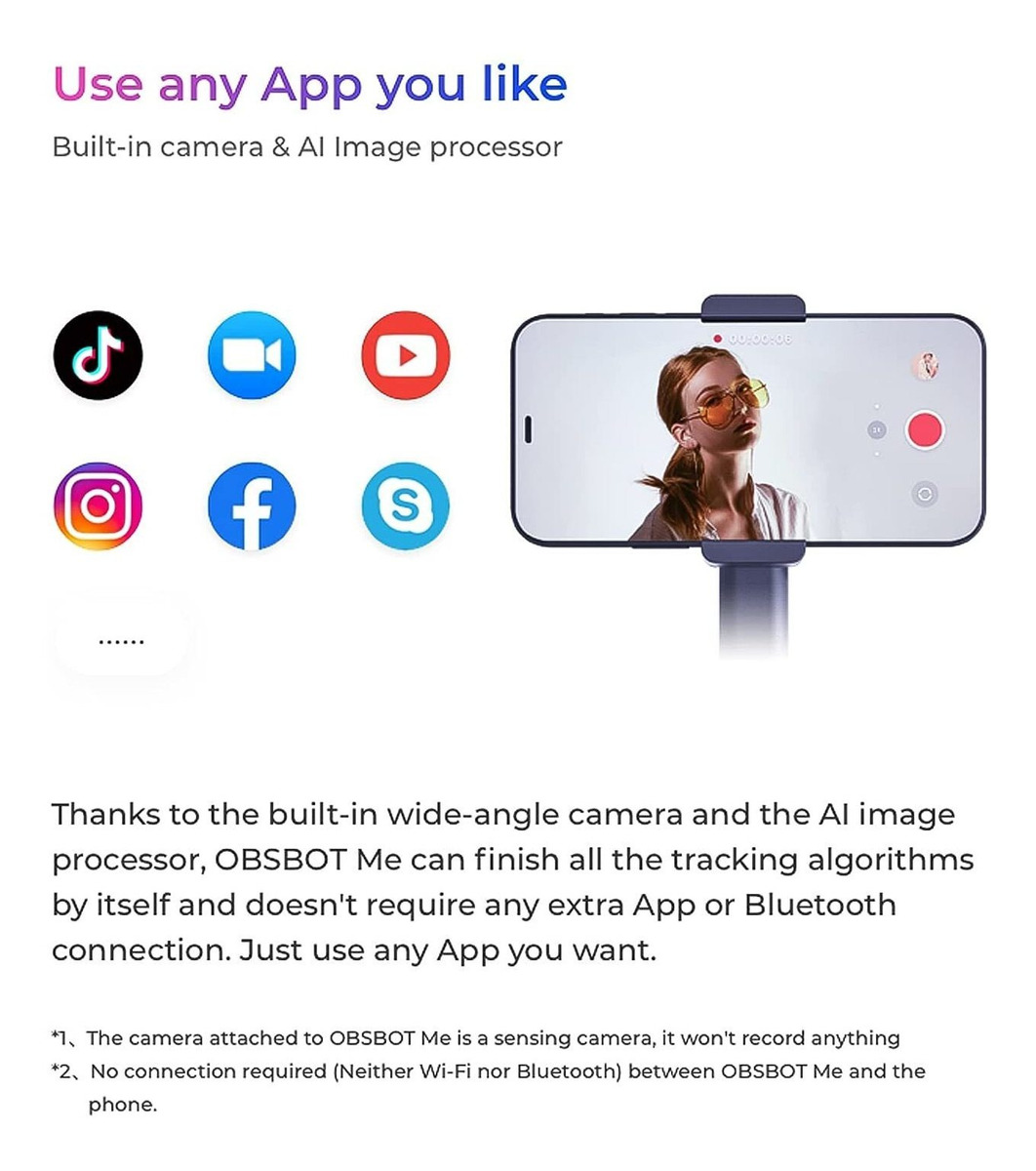 Trípode de seguimiento inteligente de cámara AIEl mejor seguimiento automático de la historia. OBSBOT Me utiliza una red neutra avanzada para lograr el seguimiento de AI. Con el motor sin escobillas, OBSBOT Me tiene una mayor velocidad de arranque, no te preocupes de que estés fuera de la imagen. En lugar de pasar tu tiempo ajustando la cámara, OBSBOT Me te proporciona una experiencia práctica definitiva.; Control de gestos y encuadre automático: en lugar de ajustar la cámara una y otra vez solo para asegurarte de que estás en la imagen, con OBSBOT Me, puedes mantenerte en el marco con un simple gesto. Solo tienes que poner una de tus manos arriba, la cámara te reconocerá y te seguirá donde vayas. Siempre rastrea de forma estable y sin problemas a la persona en el centro del marco de vídeo.; No requiere aplicación o Bluetooth: gracias a la cámara de gran angular integrada y al procesador de imagen AI, OBSBOT Me puede terminar todos los algoritmos de seguimiento por sí mismo y no requiere ninguna aplicación adicional o conexión Bluetooth. Solo tienes que utilizar cualquier aplicación que desees. La cámara conectada a OBSBOT Me es una cámara de detección, no grabará nada.; Ángulo de disparo ajustable: OBSBOT Me equipado con una articulación universal y soporte giratorio. Puedes ajustar el ángulo de disparo como quieras y mostrar tu vida desde el mejor ángulo. Con área de detección de ángulo amplio de 120 para proporcionar una mayor área visible. No es necesario restringir tu movimiento. Sé tú mismo.; Diseño plegable y extensible: OBSBOT Me está construido con una estructura plegable. El tamaño de 2.677 x 2.283 x 5.472 in se puede colocar en tu bolsillo sin esfuerzo. Siempre listo para seguir cada movimiento de tu espléndida vida. Equipado con interfaz estándar de 1/4 que te permite montarlo en tu trípode y ajustar su altura para capturar fácilmente tus resultados deseados. Todos nuestros productos estan en inglés SKU 91221078934