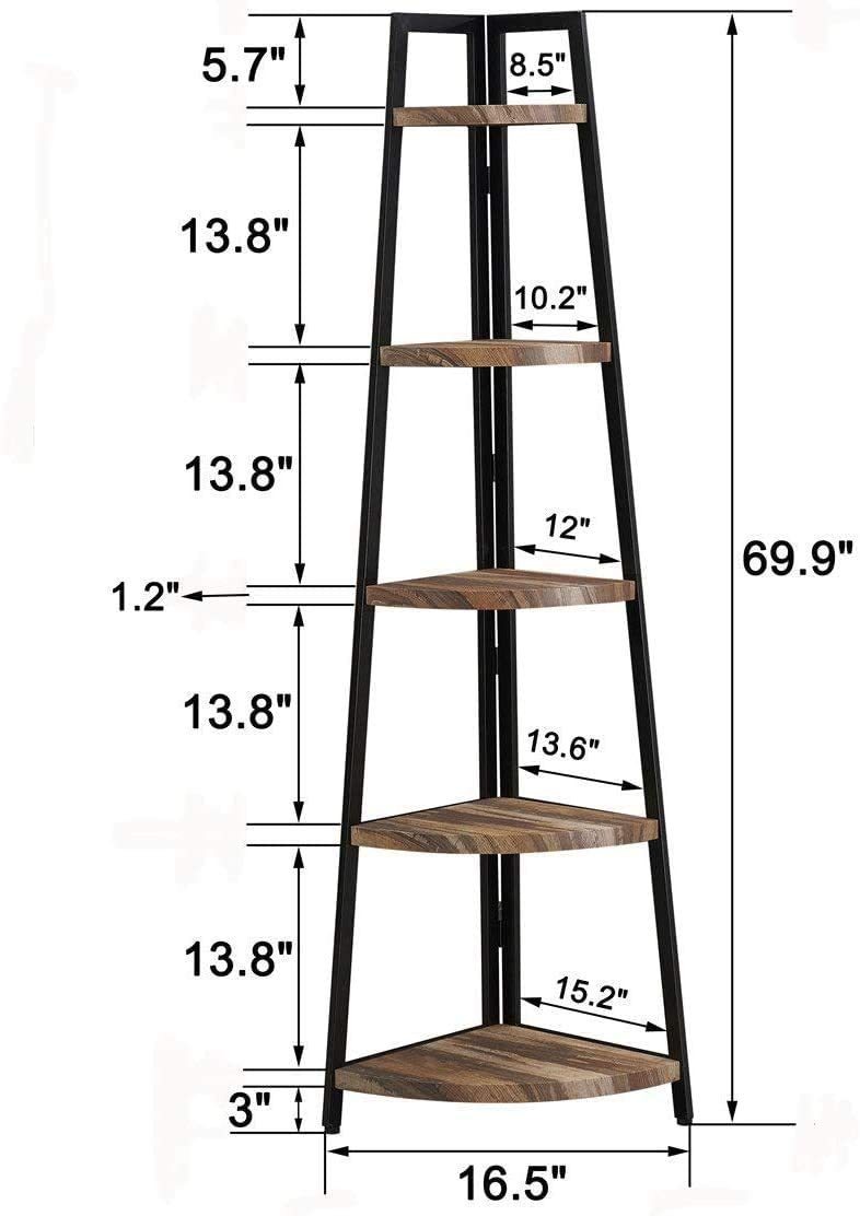 Dimensiones del estante esquinero: 16.5 x 16.5 x 69.9 pulgadas (alto); se adapta perfectamente a la pared y no ocupa demasiado espacio en el suelo.; Construcción robusta: la estantería está hecha de tablero MDF con PVC de grano de madera y marco de metal limpio. Muy resistente, proporciona una vida útil más larga.; Uso multifuncional: los estantes son lo suficientemente profundos como para sostener algunas fotos, plantas de interior y coleccionables de viaje, o puedes utilizar el estante como una estantería.; Adecuado para cualquier habitación: diseño elegante y simple que complementa bien con cualquier estilo de decoración, e ideal para tu dormitorio, baño, armario, oficina en casa, sala de estar, habitación de los niños, cocina, etc.; Fácil de montar: todas las herramientas necesarias e instrucciones paso a paso están incluidas, terminarás el montaje en pocos minutos. Todos nuestros productos estan en inglés SKU 91221011680