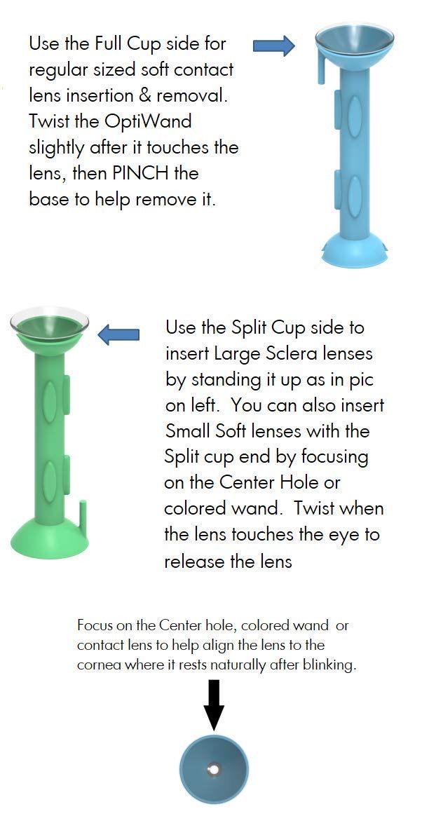 Optiwand insertos y elimina lentes de contacto blandas, pero requiere práctica y paciencia. Desplazarse hacia abajo para videos de instrucción. Utilizar sólo según las indicaciones.; Esto no es una copa de succión para la eliminación de la lente de contacto blanda. Esto ayudará a pellizcar la lente blanda. Las lentes blandas no pueda ser succionada por su composición .; proceso de inserción debe ser completado rápidamente para evitar la lente se pegue a la varita .; El optiwand está diseñado para sostener la lente hasta su puesta en córnea durante la inserción. Mira centro de color agujero de varilla o de lentes de contacto para alinear el objetivo correctamente. Cuando la lente toca el ojo, torcer la varita ligeramente para liberar la lente de la varita .; Las funciones optiwand muy diferentes de los dedos y los mismos errores se hacen por casi todos los usuarios. No es una copa de succión para la eliminación de lente blanda. Todos nuestros productos son de Estados Unidos SKU 23111804457