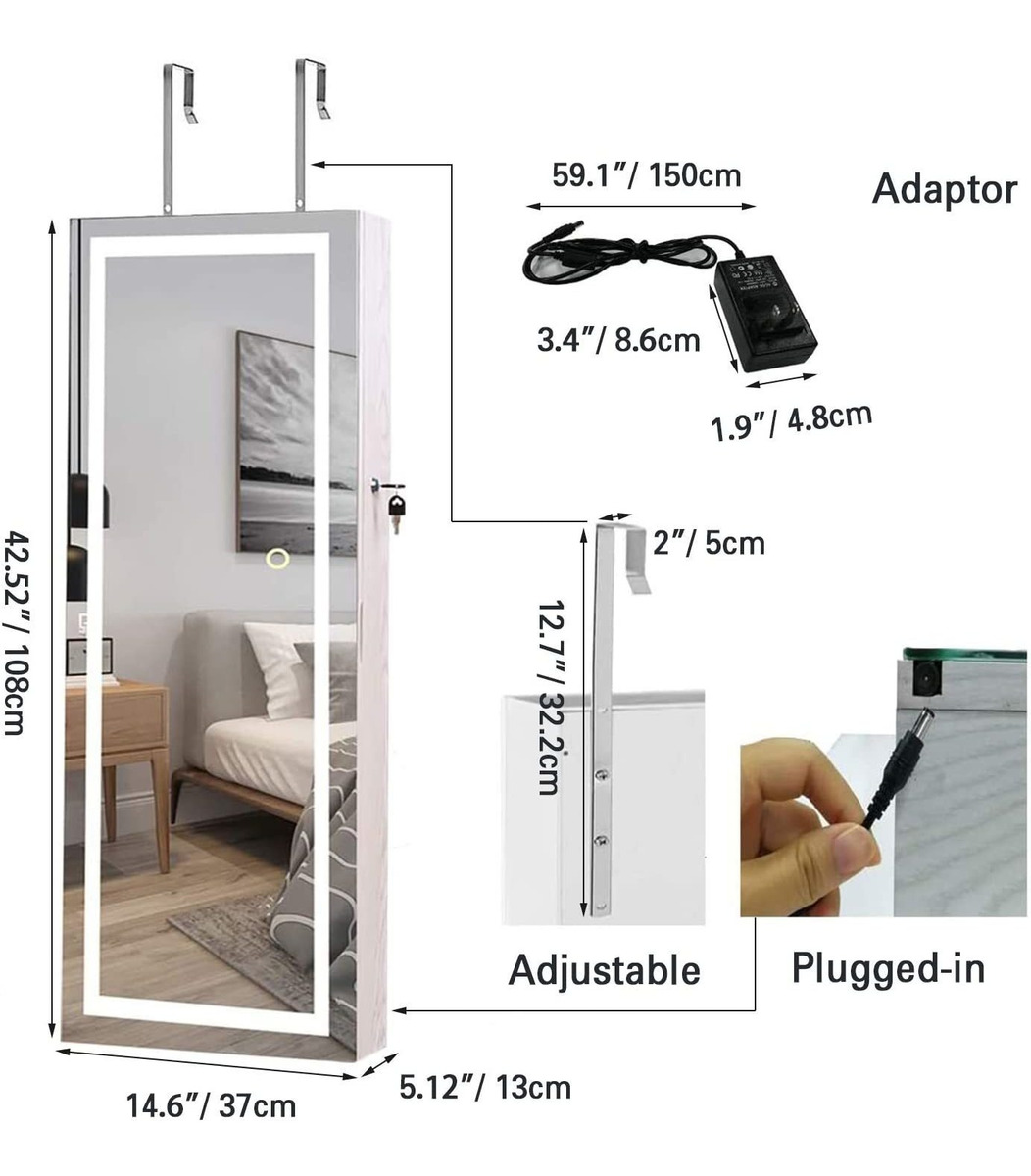 Iluminar su belleza pared LED El espejo de la puerta larga duración armario de la joyería con 3 luces LED colores ajustables, ámbar luz, la luz cálida y luz blanca, cumple con las necesidades prácticas y románticas. Encender las luces, recoger las joyas más preciosas. Este cuadro que cuelga de la joyería organizador es estético y saludable, refleja su belleza mejor .; Inteligente Interruptor táctil y cargador adaptador Nuestro gabinete de la joyería en el espejo de la puerta se deshace de las viejas luces cambian. Este interruptor táctil inteligente hace que todas las mujeres sean delicada chica simplemente haciendo clic en el círculo en el espejo, para controlar las luces. Este espejo armario de joyería con un adaptador de cargador de Estados Unidos, es fácil enchufado para cargar, no alimentado por baterías, más el ahorro de dinero y el medio ambiente .; Fantástico Capacidad de almacenamiento Esta joyería pared organizador mantiene todas sus joyas a la perfección, con 108 ranuras pendiente, 78 ranuras anulares, 36 de collar y pulsera ganchos, 3 compartimentos para cosméticos y maquillaje, 3 cajas y 1 barra de colgar y 1 bolsillo transparente con cremallera. Ideal para la colección de joyas de casi cualquier tamaño: cadenas, pulseras, pendientes y relojes, se puede almacenar, acceder y tratar en su joyería de una manera elegante y eficiente .; espejo de cristal elegido-Bueno de calidad y seguridad con la parte superior de madera 1 de la norma P2, el gabinete de la joyería está libre de laca y tiene bastante cubo grano en él, el paño interior es degradable, bueno para el medio ambiente y la salud. Nuestro gabinete de la joyería tiene una cerradura de alta calidad y llave, un armario de los niños a prueba, que puede mantener a sus hijos a raya si quieren jugar a disfrazarse o simplemente quieren saber qué gustos de oro como .; Pared y la puerta Monte joyería armario con espejo pared y la puerta de montaje aprobado, se puede colgar de la pared del organizador de la joyería en la puerta con ganchos, así como montar en la pared con tornillos. Hay 3 alturas diferentes disponibles. Este maneras pueden ayudarle a ahorrar más espacio. Y fácil de montar. Este armario es fácil de montar con la instrucción de fácil lectura. ORAF está comprometida con la satisfacción del cliente al 100%, si usted tiene algún problema, no dude en ponerse en contacto con nosotros. Todos nuestros productos estan en inglés SKU 6102015294