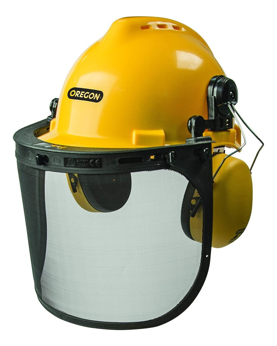 Casco resistente a los impactos con 6 orificios de ventilación para una alta transpirabilidad.; Arnés de 6 puntos de ajuste fácil para un ajuste preciso. Visor para sol desmontable. Orejeras articuladas montadas en la tapa.; Visera de malla de acero inoxidable más amplia y duradera, con función abatible/abatible. Oregon chainsaw safety helmet/visor combination with ear protection. Includes 6 ventilation holes, adjustable harness, flip up/down visor, adjustable earmuffs. Todos nuestros productos estan en inglés SKU 15092136993