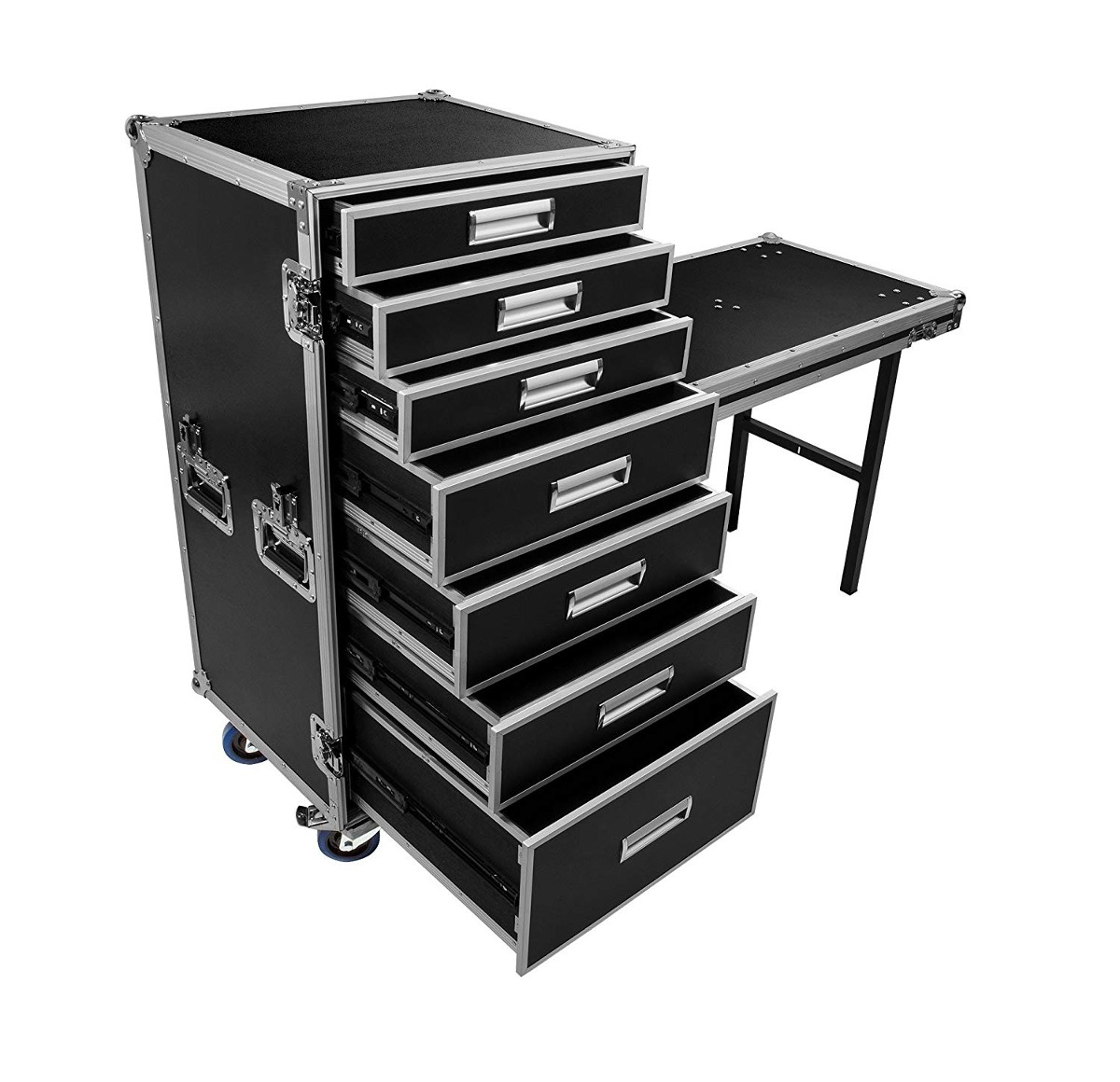 Este caso utilidad 7-cajón multi-funcional se construye de 3/8″ de madera contrachapada, esquinas de alto impacto de bola, guarnición de borde de aluminio, manijas de resorte empotradas pesados ¿¿y 4″ ruedas de deslizamiento fáciles. El tremendamente popular Pro-Trabajo está diseñado a medida con 7 cajones de servicios públicos y un accesorio de mesa de pie-tapa en la tapa frontal que se pueden configurar a cada lado de la caja y es el complemento perfecto para redondear su flota de bastidor y la caja. Una vez configurado, la mesa se encuentra 28″ a la superficie superior de la mesa, es de 38″ de ancho izquierda a derecha y de 21″ delante profunda hacia atrás. El borde de la mesa es de 24-3 / 8″ del piso así que los artículos más cortos que 24 «se adaptan con facilidad debajo de la mesa. los cajones de servicios públicos son rellenados por todos lados con espuma negro rígido y la tapa frontal se rellena con espuma de perlas para mantener los cajones en su lugar durante el transporte. Desde hace más de una década, OSP ha estado proporcionando los casos de calidad para precios asequibles. Ya sea que esté rodando en una arena diferente cada noche, configurar y derribar una iglesia portátil todos los domingos, o simplemente tomar su amplificador a través de la ciudad para el concierto de esta semana, encontrará un caso OSP ser un compañero perfecto para mantener su equipo de seguridad durante el transporte. Todos nuestros productos son de Estados Unidos SKU 30081819855