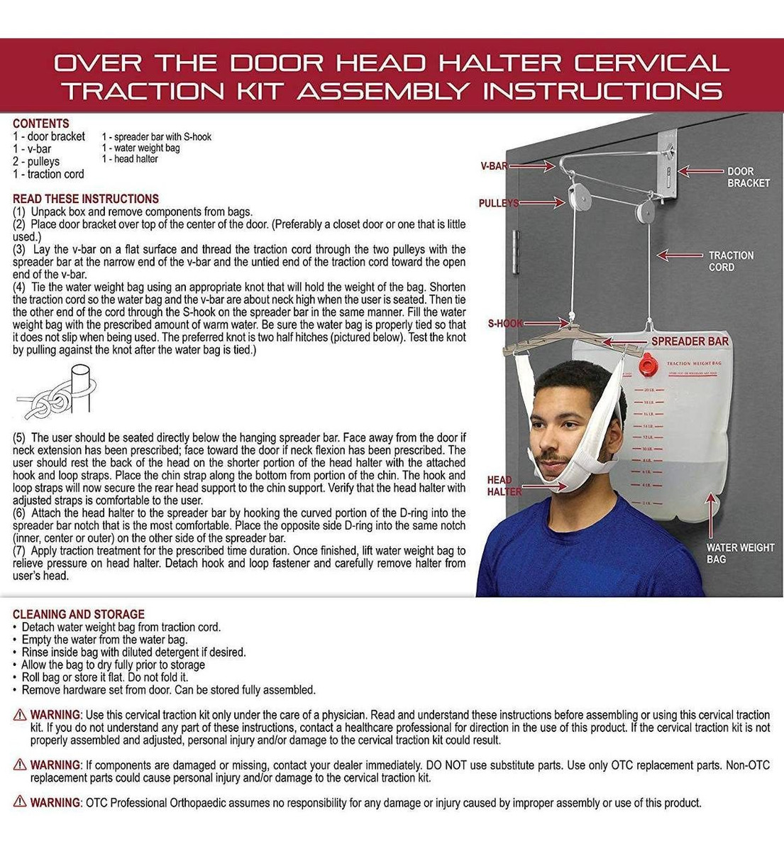 OTC marca, modelo 2501, sobre el arnés de cabeza puerta con kit de tracción cervical para hombres y mujeres; Se utiliza para aliviar el dolor en el cuello, la presión sobre el músculo, tejido nervioso y fracturas menores de la columna cervical, artritis, abultamientos en los discos, hernias, y terapia física; Fácil configuración para uso doméstico; soporte de metal resistente se coloca sobre cualquier puerta, y la bolsa de peso se calibra de 2 libras a 20 libras; simplemente llenar con agua del grifo; kit completo incluye: arnés de cabeza, barra de separación metal, soporte de la puerta de metal, suspensión de puerta con dos poleas, sección de cuerda, y la bolsa de peso de agua fácil de llenado; arnés de cabeza ajustable tamaño cabe la mayoría de los adultos, y es libre de látex OTC marca (modelo 2501) sobre el kit de tracción cervical puerta. Se utiliza para aliviar la presión sobre el músculo, tejido nervioso y fracturas menores de la columna cervical. Se fija fácilmente para uso en el hogar. El soporte de metal resistente se sujeta sobre cualquier puerta, y el Peso de la bolsa está calibrado de 2 libras. a 20 lbs .; fácil de llenar con agua del grifo. El kit incluye: arnés de cabeza, acolchada y ajustable; barra separadora de metal; soporte de la puerta de metal; suspensión de puerta y dos poleas; sección de la cuerda; Peso de la bolsa de agua. Uso para: Indicado para el dolor del nervio de hernias discales, dolor articular vertebral, espasmo muscular, perdida de movimiento espinal; contraindicado en los casos de lesión aguda cervical, osteomielitis, inestabilidad de la columna y la hipermovilidad, tumores, artritis reumatoide Todos nuestros productos son de Estados Unidos SKU 26091841583