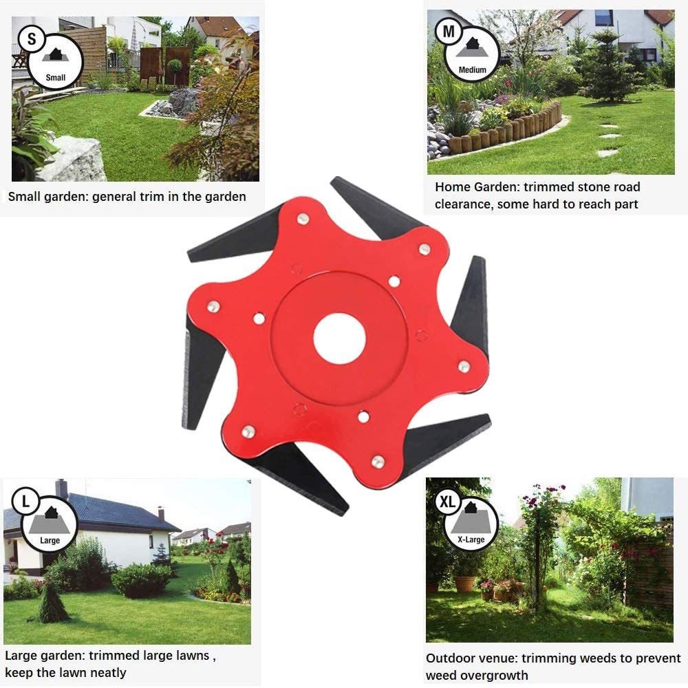 SUITABLE APPLICATIONS: 1 inch hole universal blade trimmer fit 99% straight shaft strimmer. If you havent used similar blade products before, you need installation kit. The selection of kit needs to see your mower. The number of teeth of the straight axis is 6 or 10.; ENHANCED VERSION: Blade is fired to increase the hardness of the blade and make the rotation more flexible, which will be more useful to trim your garden. Trimmer head suitable for cutting branches, brush and shrubs.; MATERIAL: The weed eater blades metal is made of manganese steel, and the insert has high hardness and long service life. Please dont let the blade hit stone and other solid objects, the blade will be blunt or even damaged.; INSTALLATION: The weed trimmer head is very easy to install, just follow the instructions for installation. Only mowing blade, if other accessories are needed, accessories shall be selected according to different mower models.; If our strimmer head does not match your mower model, please let us know by email, we will refund the refund for you to ensure that our products are satisfactory to every customer.Buy with confidence now Color:Red