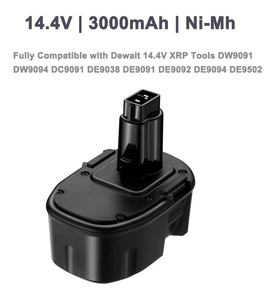 Información de la batería: Tipo: Ni-Mh, voltaje: 14,4 V, capacidad: 3,0 Ah. Batería de repuesto de 14,4 V para Dewalt.; CompatibilidadCompatible con Dewalt 14.4V herramienta de alimentación sin cable DW9094, DC9094, DC9091, DE9091, DE9038, DE9094, DE9092, DE9031, DE9502, DW9091, DW935.; Estándares de alta calidad: protección integrada contra sobrecarga, sobredescarga, sobrecorriente, proporciona protección contra cortocircuitos y circuito de voltaje constante. Sin efecto memoria, se puede cargar o descargar según sea necesario sin pérdida de capacidad.; Inspección cualificadaEstas baterías funcionan como el original, los productos están certificados CE, FCC y RoHS, probados por el fabricante para que coincida con los productos OEM, seguros para ti o tus miembros de la familia para usar.; Protección después de la venta: todos los productos Wakitt ofrecen 12 meses para resolver problemas de calidad desde la fecha de compra. Si encuentras algún problema con la calidad del producto, ponte en contacto con nosotros inmediatamente por correo electrónico y haremos todo lo posible para resolverlo. Detalles del producto: