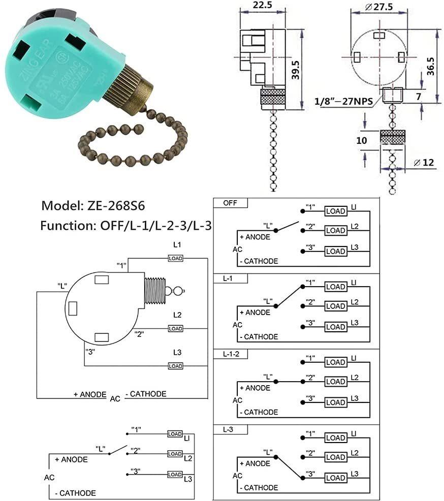 El paquete contiene: incluye 2 interruptores de ventilador de techo Zing Ear ZE-268S6.; Certificaciones: aprobado por UL (USA) certificado CSA (Canadá).; Excelente calidad: 6 A/125 V CA, 3 A/250 V CA. Aprobado por UL, estos interruptores de ventilador de techo se fabrican de acuerdo con nuestras más estrictas directrices de calidad, lo que reduce el costo de reemplazo y mantenimiento.; Función: interruptor de control de velocidad del ventilador de 3 velocidades y 4 cables: apagado, alto, medio, bajo (L-1, L-2-3, L-3). Estos interruptores de ventilador de techo son ideales para ventiladores de techo, lámparas de pared, luces de armario. Funciona bien en cazador, casablanca, brisa del puerto, bahía de Hampton, etc.; Nuestra garantía: proporcionaremos el mejor producto y servicio a cada cliente. Tu satisfacción es nuestro objetivo y motivación. Ponte en contacto con nosotros si tienes algún problema, haremos todo lo posible hasta que estés satisfecho. Compra sin riesgo. Todos nuestros productos estan en inglés SKU 4022215882