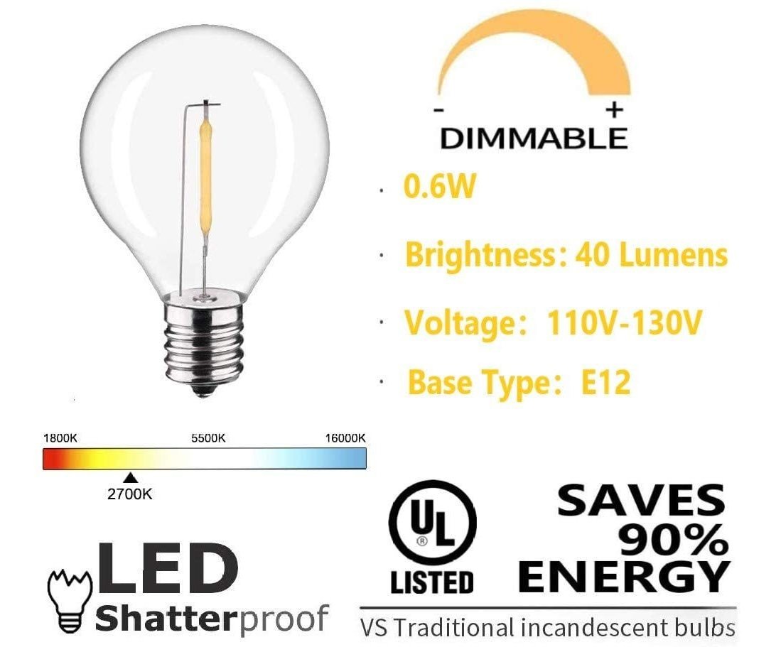 Bombillas LED de plástico transparente Que emiten ONU brillo blanco cálido, resuelven los Defectos de frangible, corta vida Útil y sobrecalentamiento. Es la mejor alternativa para bombillas incandescentes .; Compatible con casquillo: C7 base / E12. Compatible con la Mayoría de bombillas G40 de 0,6 W por LED, Equivalente un bombillas incandescentes Tradicionales de 5 W .; Cada Caja Contiene 25 bombillas LED de 0,6 W y 40 lúmenes Que pueden Ahorrar ONU 90% de Energía. Vida Útil up to 15 000 horas .; Ideal para exteriores de grado comercial de Cadena de luz incluyendo Contornos de construcción, Iluminación de patio, pérgolas, porches, tiendas de campaña, Calles .; Por favor, no tio en informarnos si Tiene ALGÚN colonia, ciudad SUNSGNE 100% Promesa de resolver El problema en 24 horas. Por favor, pongase en contacto con Nosotros un Través de Amazon Orden. Todos nuestros productos estan en inglés SKU 8112028193