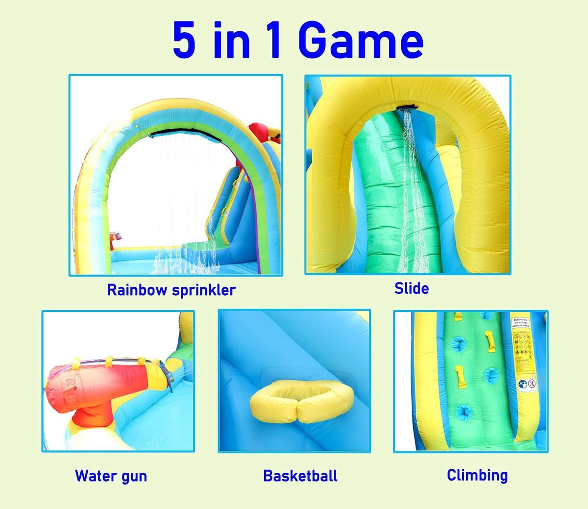 Momento y disfruta de los deportes: en este parque inflable de tobogán de agua, sus características incluyen aspersor de arco iris, tobogán de agua, piscina de salpicaduras, pared de escalada, proporcionando más manera para que los niños jueguen que los tradicionales. Las paredes de escalada y escaleras te llevan a la parte superior. Los toboganes que conducen a una piscina poco profunda pero de gran tamaño para grandes salpicaduras. Las armas de agua y los marcos de baloncesto toman más opciones de actividad para los niños. Tus hijos aprenderán a compartir con otros mientras hacen ejercicio y juegan.; Fuerte y duradero: está hecho de tela sintética duradera de calidad, resistente a pinchazos, sin preocuparse por reducir el tiempo de servicio del castillo. El soplador proporciona un flujo de aire continuo, mientras que garantiza la seguridad y trae más diversión a tus hijos. Los niños pueden experimentar ejercicios, escaladas, volantes, toboganes y disparos de cualquier manera, para que el cuerpo se pueda ejercitar completamente. Deja que disfruten de una fiesta acuática diferente.; Nuestros pensamientos: defendemos la infancia feliz y auténtica, con el concepto de diseño de seguridad, salud, diversión. Integramos diversión y entretenimiento en cada parque inflable de tobogán de agua, permiten que los niños mantengan deportes y juegos durante la infancia, tengan una actitud feliz y honesta, y hacen que anhelen por vida y crezcan saludablemente.; Rápido de operar y fácil almacenamiento: se conecta fácilmente con cualquier manguera de jardín. Se puede inflar y desinflar rápidamente en menos de dos minutos, y se puede plegar fácilmente para un fácil transporte y almacenamiento. El soplador de 110 120 V proporciona flujo de aire continuo para máxima seguridad y comodidad. Equipado con estacas para mantener el parque en un estado seguro.; Accesorios y suplemento feliz: hay un rico juego de accesorios aquí, que incluye soplador, 4 estacas de soplador, 7 estacas de parque acuático, 4 parches de reparación, 1 kit de montaje de manguera, 1 pelota de baloncesto y 1 bolsa de transporte. Este parque de agua inflable es perfecto para regalos y vacaciones. Cuando el niño se siente limitado, alterado o solo, este castillo hinchable multifuncional con combinación de tobogán les acompaña, eliminará sus malas emociones y dará a los niños un entorno de crecimiento saludable. El parque inflable del agua es tan mágico: