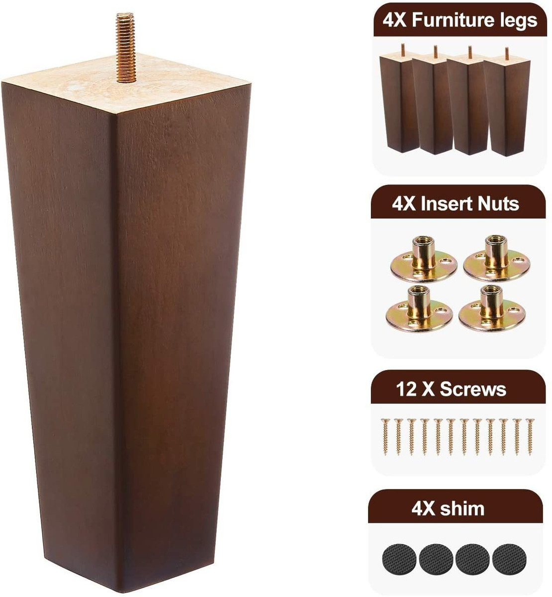 Calidad fiable Nuestras patas de madera para muebles ESTÁN Hechas de Materiales de madera de caucho de Alta Calidad, Que Son y fuertes Estables. El juego completo de Productos Despues de la Correcta Instalación PUEDE soportar 1,763.7 lbs, y ha Sido Cuidadosamente Seleccionado, con exquisita artesanía y Aspecto hermoso; Almohadillas de Protección del Suelo y Evitar ruidos HEMOS Instalado juntas en la parte inferior de Nuestros pasteles de muebles para Proteger el Suelo y Evitar el ruido, por Lo Que PUEDES Ahorrar El problema de Elegir e Instalar juntas protectoras y Placas de Montaje de Patas .; Eleva la altura y antihumedad Las patas del sofá añaden altura de tus muebles Perfectamente Para Que Puedas Para entrar o salir del sofá Más facilmente, y Ayudan a que tu robot mar Capaz de ir Debajo del sofá para Limpiar. Y eso Tiene el efecto de antihumedad y evita la Suciedad, también te da Más espacio de Almacenamiento Debajo de tus muebles .; Fácil de Instalar Cada paquete INCLUYE 4 patas de madera de 6,0 en y 4 juegos de tornillos de 0,3 en (M8) Estándar de EE. UU. de 0,3 en. Todos los accesorios ESTÁN completos, simplemente Conecta, Instala y aprieta los tornillos para USAR. Es Muy Fácil reemplazar los pasteles viejos e instalarlos Nuevos .; Amplias Aplicaciones Las patas de Son repuesto adecuadas para Todo tipo de muebles, y se pueden Como utilizar para patas de sofá, patas de cama, patas de mesa de café, patas de escritorio, las patas de Armario, patas de TV, patas de armario, patas de Armario, patas de tocador, patas otomanas, en any Estilo de Mediados de Siglo o moderno. Ideal para tu Proyecto de bricolaje. Tamaño: 6 Pulgadas