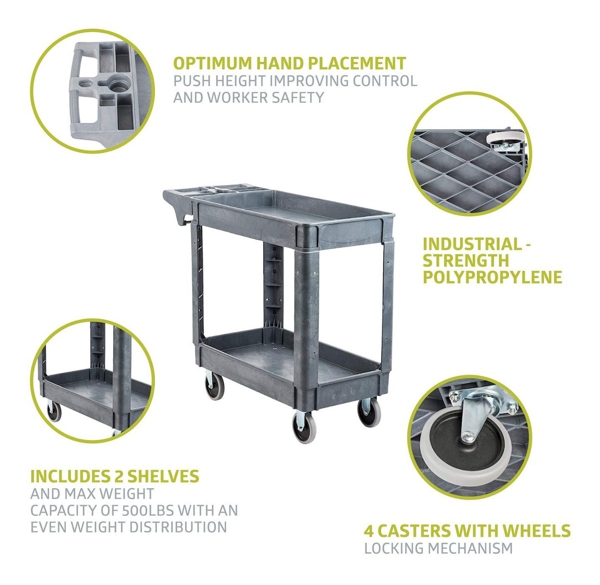 DURABLE, PESADA carrito- DUTY utilidad incluye 2 estantes, construidos a partir de polipropileno fuerza industrialización permitiendo capacidad de peso máximo de 500 libras con una distribución de peso incluso; NIVEL 2 Storage- Puede soportar el almacenamiento en 2 estantes de ancho, de productos diversos, tales como suministros de oficina, herramientas, artículos de limpieza, y varios otros artículos. Varios ajustes útiles, tales como garaje, escuela, restaurante, lavado de coches, taller mecánico, el hospital y los sitios industriales; MATERIAL DE COMPRAS CON LA fácil de maniobrar RUEDAS Y BLOQUEO frenado 4 ruedas en la parte inferior de la plataforma de fácil, y movimiento silencioso, haciendo que el transporte fácil y sin interrupciones; Carro trabajo abarca una empuñadura de diseño ergonómico – Diseño de la compra segura y confortable ofrece óptima colocación de la mano y la altura empuje mejorar el control y la seguridad del trabajador; UTILIDAD Carro RESISTENTE Composición gráfica – estantes son estantes son 32 “w x 17” d de tamaño. Cada estante puede contener hasta 250 libras. Tamaño: 1- (Pack)