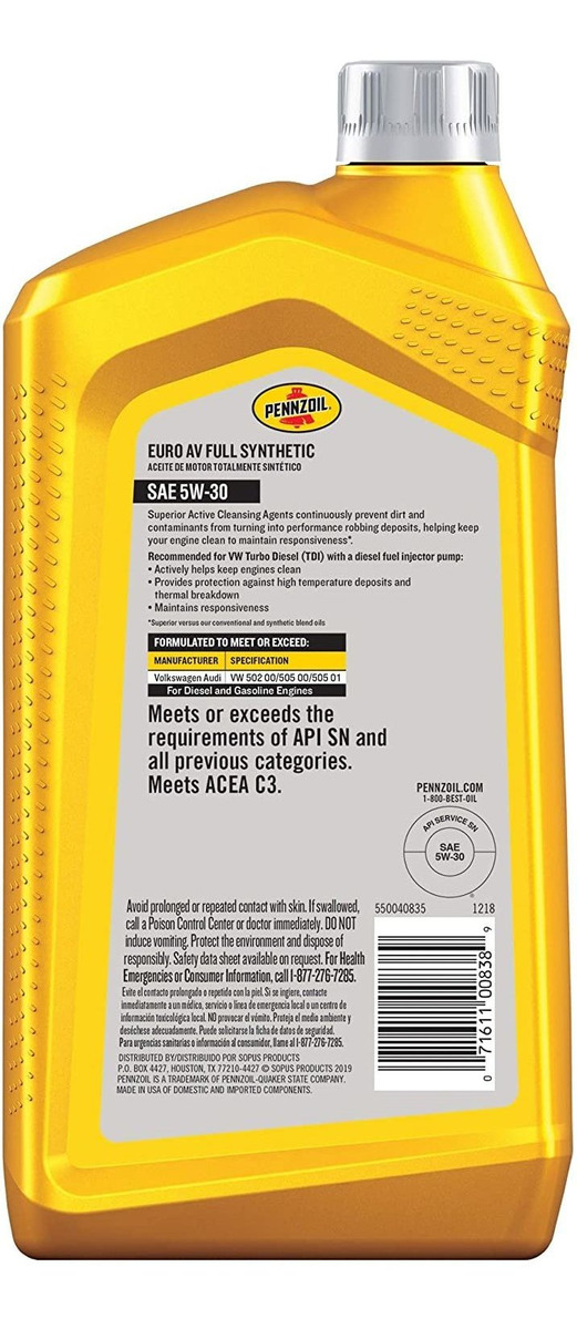 Specification: Pennzoil 550040835 Euro Av Sae 5w-30 Full Synthetic Motor Oi