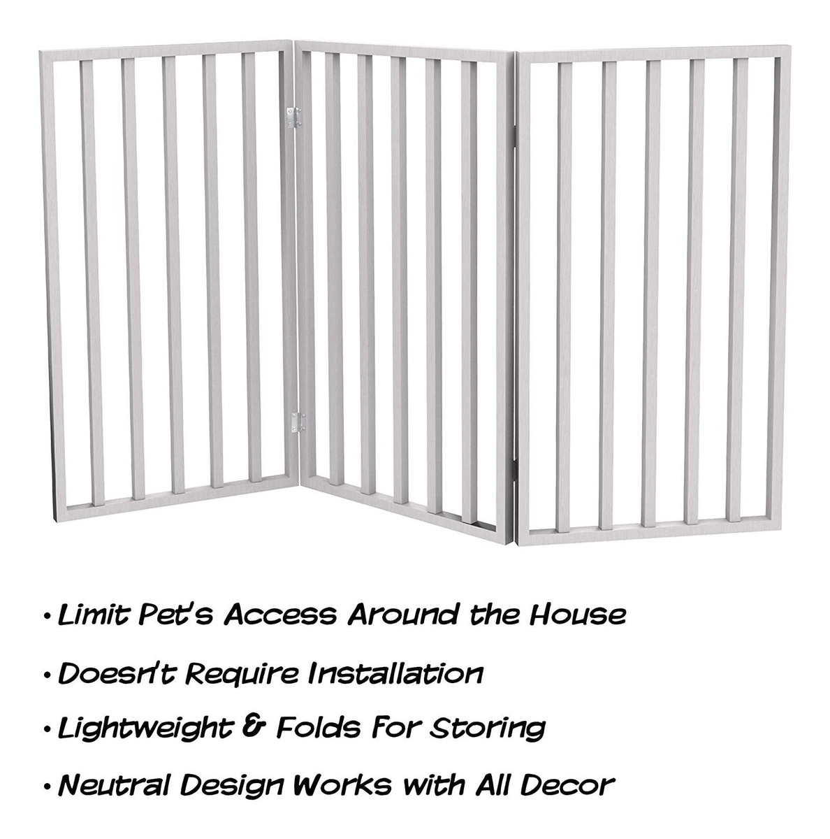 Limitar el acceso TODO EL CASA- La puerta de madera de altura ayuda con eficacia y seguridad restringir el acceso o limitar su amigo de cuatro patas a cualquier habitación de la casa. También es ideal para usar para bloquear ciertas áreas de la casa, pasillos, escaleras, y mucho más .; CONVENIENTEMENTE FOLDS- Esta puerta para mascotas se pliega junto a un tamaño más compacto para el almacenamiento conveniente o transporte de una habitación a. Es ligero, pero lo suficientemente resistente como para barricada de su perro, perrito, u otros animales domésticos donde desee !; NO INSTALACIÓN sea preciso: A diferencia de las puertas tradicionales, esta puerta de estilo acordeón no requiere instalación, hardware o perforación que podrían dañar su hogar. Simplemente desplegarlo y bloquear el área que necesita !; COLOR DE NEUTRAL Esta barrera es una manera perfecta limitar el acceso a partes de su casa mientras se mantiene una apariencia elegante. El acabado blanco neutro es una alternativa atractiva para mascotas puertas de plástico / bebé y complementos mayoría de los estilos de decoración del hogar y esquemas de color .; PRODUCTOS detalles-Dimensiones: 1 del panel: 18′ x 32 «H, Total: L: 54″, W: 1″ , H: 32» . Material: Materiales: madera y metal (bisagras). Terminar: Blanco Todos nuestros productos estan en inglés SKU 15042009897