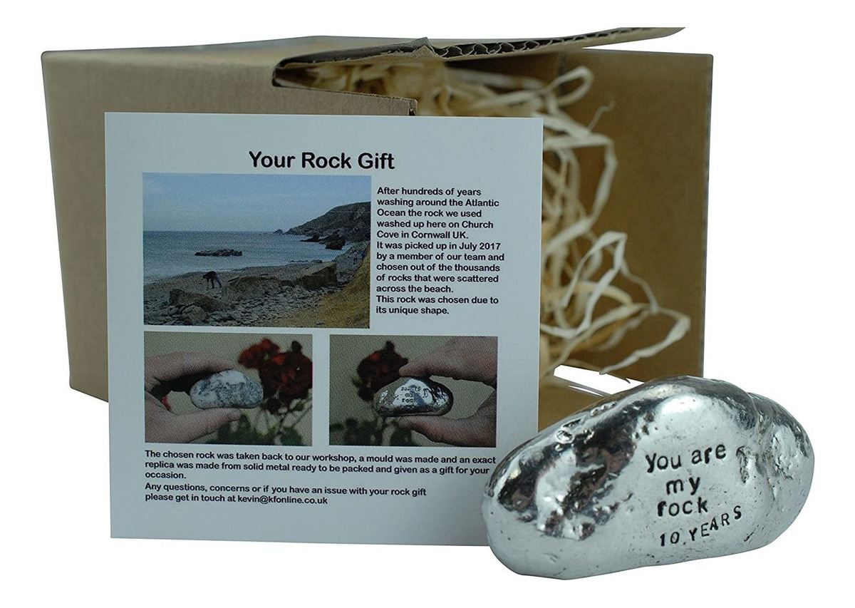 Metal macizo, roca de metal pesado de calidad, pesa 7.05 oz; Hecho de estaño 100% puro pulido para brillar con las palabras You are my rock 10 years; Idea de regalo para el décimo aniversario de boda tanto para él como para ella; Empaquetado en paja de madera; Viene con un pequeño deslizamiento en el interior llamado The Story of Your Rock que explica de dónde proviene la roca original Esta es una bonita idea de regalo de aniversario y algo único para dar a tu novio, novia, marido o esposa para tu décimo aniversario diseñado para regalar a alguien que ha sido tu roca durante 10 años. Hecho de lata 100% pura y fundido de una roca real que se encuentra en una playa de Cornualles. Creamos una impresionante réplica de metal sólido, esta es una roca de calidad pesada que sería un gran ornamento. Perfecto para el décimo aniversario donde quieres dar algo especial y algo único que no habrás visto antes. Cuenta con las palabras you are my rock 10 years. Fabricado en el Reino Unido, este artículo es perfecto. Peso: 7.05 oz. Tamaño: 2.559 in x 1.299 in x 0.984 in. Todos nuestros productos estan en inglés SKU 15092117625
