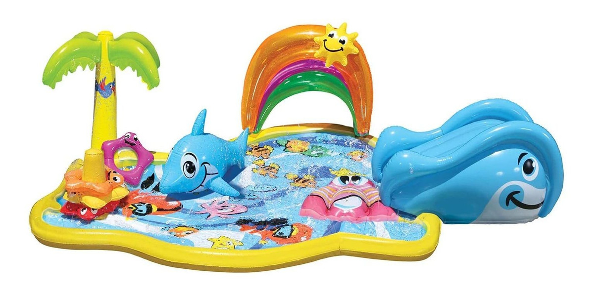 90 L x 68 W x 24 H alfombra de juegos hinchable con water-sprinkling actividades; Una introducción perfecta a agua Play; Rainbow toldo ofrece sombra alivio del sol; Cuenta con una estrella de mar Stacker, extraíble Slide de ballena y delfín Rider actividades; Durable PVC. A Backyard Water Park! Transform your backyard into a junior ocean adventure! Little ones will love to stack starfish on the sprinkling post or slide down the whales back and onto a water-cushioned oyster shell for a surprise splash landing, They can even take a ride on a baby dolphin or relax under the cool shade of the rainbow canopy. Its the ideal way of introducing water play while staying cool all summer long! The water park is 90 x 68 x 22 when set up. Contents includes 1 splash mat, 1 inflatable dolphin. 1 inflatable whale slide, 4 inflatable starfish rings and 1 repair patch. Todos nuestros productos estan en inglés SKU 15092103753