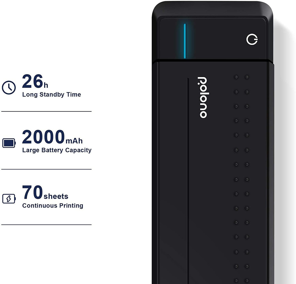 Amplia conexión Bluetooth 4.0, compatible con Android / iOS Mobile, también compatible con Windows, computadora Linux, laptop, y también funciona con iPad. (Nota: aunque MAC no es compatible con Bluetooth actualmente, puedes conectar fácilmente un portátil Mac o Windows con la impresora a través de un cable USB. También debe tener en cuenta que la impresora no es compatible con ChromeBook actualmente.; Gran capacidad de batería: con una batería incorporada, puede imprimir 70 copias cuando está completamente cargada. Con una batería integrada de 2600 mAh, 26 horas de tiempo en espera, se puede cargar completamente para imprimir 70 copias, cable tipo C para una carga segura.; Pequeño y portátil: lo suficientemente pequeño como para caber fácilmente en un maletín o bolso de hombro y se sostiene fácilmente en una mano. Impresora móvil Polono A4, imprime en cualquier momento y en cualquier lugar. La distancia entre el hogar y la oficina se acortará, y el lugar de trabajo ya no se limitará.; Impresora ecológica: la impresora Polono utiliza tecnología de transferencia térmica, sin tinta, solo necesitas reemplazar la cinta térmica.; Alta resolución: impresión de papel A4 común, alimentación automática del papel, alta resolución de 300 ppp, hace que el documento de impresión sea más claro. Todos nuestros productos estan en inglés SKU 91221058960