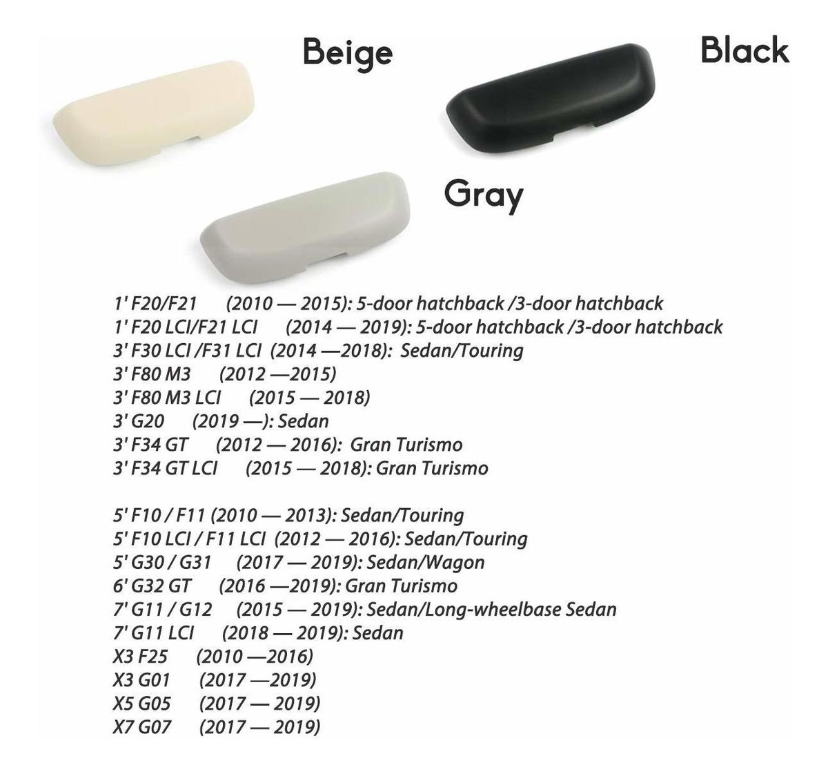 Lentes hechos a medida caja para el BMW 1 3 5 6 7 X3 X5 X7 Series. Por favor, compruebe la lista vehicels compatible en la siguiente descripción .; En contraste con el caso de las gafas de sol visera, es más cómodo de usar. Usted no tiene que quitar la caja de vidrios cuando se utiliza el parasol. No bloquea la línea de visión como una caja de vidrios del visera de sol, pero hace que el interior más coordinado .; Hecho de material de PC soild ABS +, la superficie de la caja de vidrios es un revestimiento liso con un toque delicado .; Reemplazar para el lado del conductor / pasajero asidero arriba. Ajuste perfecto para el caso original position.Glasses asa coche puede contener vidrios con longitud inferior a 6,6 pulgadas, wideth menos de 2,4 pulgadas, la altura de menos de 1,57 pulgadas .; El resorte de amortiguación tiene una tensión bien, permite a la caja de vidrios para cerrar lentamente, y mejor protege el video de instalación glasses.The se muestra en la imagen. Todos nuestros productos estan en inglés SKU 6012020656