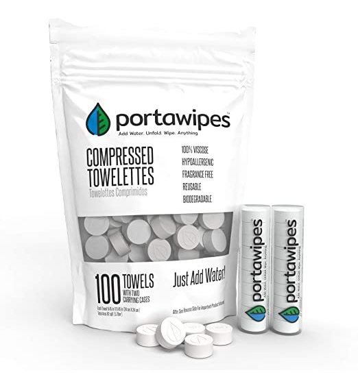 100 Toallas de portawipes comprimidos mas dos tubos de Almacenamiento de Viaje impermeables