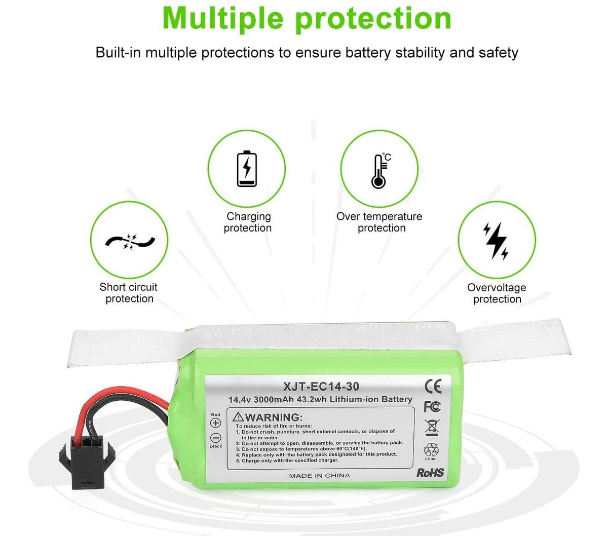 Función de batería: 14,4 V, 3000 mAh, iones de litio, sin efectos de memoria. Certificado CE, FCC, PSE, RoHS, no tienes que preocuparte por que la batería dañe la máquina. La alta capacidad de 2,8 Ah dura más de 2,6 Ah, la carga completa puede durar alrededor de 100 180 minutos. El tiempo específico varía según el modelo de la máquina y la edad, la mayoría de las cuales duran 2 horas.; 100% Compatible: Sólo compatible con Ecovacs Deebot N79, Deebot N79S, Deebot DN622, Eufy RoboVac 11, RoboVac 11S, RoboVac 11S MAX, RoboVac 12, RoboVac 15C, RoboVac 15C MAX, RoboVac 15T, RoboVac 15T, RoboVac 15T Vac 30, RoboVac 30C, RoboVac 30 MAX, RoboVac 35C. La batería se basa en el tamaño original y la función es la misma que la batería original.; Capacidad de 3.0 Ah y segura: completamente cargada alrededor de 5 6 horas; limpia durante al menos 120 minutos por carga. Carga segura: celdas de batería de litio de grado A, protección integrada contra posibles daños causados por sobrecarga, sobrecalentamiento y protección contra cortocircuitos. No se calienta cuando se carga, te protege a ti y a la máquina. Hace que tu RoboVac funcione más tiempo y sea duradero.; Fácil de instalar: se instala en 2 minutos simplemente retira los dos tornillos en la parte inferior, retira el conector de la batería y conecta el nuevo, luego revive tu robot de nuevo.; Vida útil más larga: Normalmente, ciclo de carga de más de 300 a 500 veces. Si se carga una vez cada 3 días, puede cargar al menos 3 años. 30 días de devolución de dinero, 12 meses de garantía, dentro de 24 horas de servicio al cliente. Todos nuestros productos estan en inglés SKU 4022246521