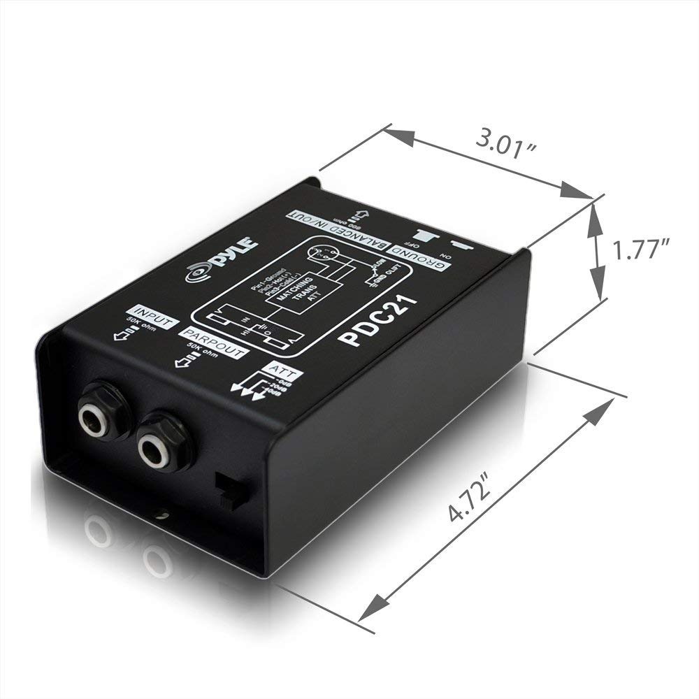 Pyle PDC21 es una necesidad si usted está buscando el higest calidad de sonido, con baja distorsión, ruido y eliminar bucles de tierra. Una unidad DI, caja DI, Box directa, Entrada directa, inyección directa o simplemente DI es un dispositivo electrónico que se conecta una alta impedancia, nivel de línea, la señal de salida desequilibrada a una entrada balanceada nivel de micrófono de baja impedancia, por lo general a través del conector XLR. DI se utilizan con frecuencia para conectar una guitarra eléctrica o un bajo eléctrico a la entrada de micrófono de una mesa de mezclas. El DI realiza la concordancia de nivel, el equilibrio, y, o bien de amortiguación activa o pasiva de impedancia para minimizar la reducción de ruido, distorsión, y los lazos de tierra. DI no llevan a cabo la adaptación de impedancia. Pyle ha estado en el negocio durante más de 35 años, y su experiencia en la fabricación y la experiencia es fácil de ver – y oír. Todos nuestros productos son de Estados Unidos SKU 30081817413