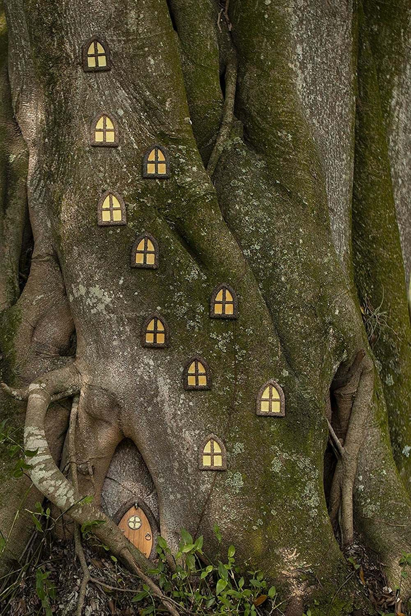 Bienvenido a las hadas, gnomos y duendes en su jardín con esta encantadora puerta de hadas y ventanas! Adjuntarlo a un tronco de árbol con el hardware incluido y fácil configuración.