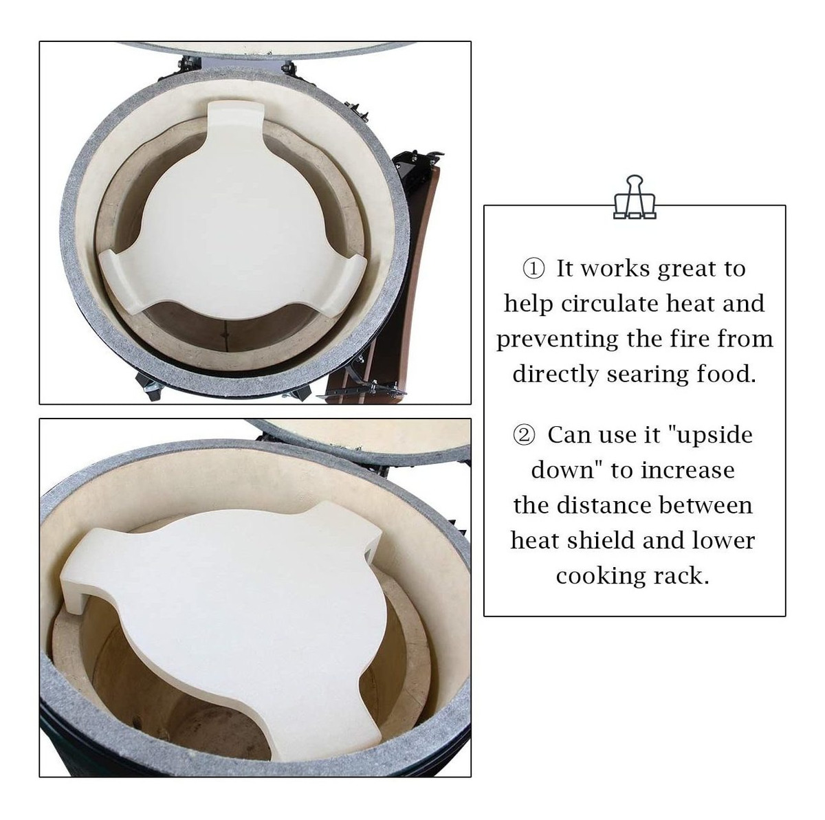 Accesorios perfectos para grandes huevos verdes Ajuste para gran gran gran huevo verde bonito reemplazo, también para parrilla de kamado de 18.0 in, parrilla de Chargriller de 18.0 in Akorn Kamado. Se adapta a la parrilla de visión con superficie de parrilla de 18.0 in. El más grueso alcanza 7/8 pulgadas, longitud de pierna de 2.0 in. Producir resultados sin igual, ya sea para asar, asar, asar, asar, fumar o hornear.; PiZA de alta temperatura: sostiene hasta alto calor fino, material de cordierita resiste la temperatura más de 35.6 F, control más fácil de la temperatura y el humo. La placa deflector tiene 3 patas y se utiliza para desviar el calor cuando haces cosas como una pizza o pollo.; Cocina indirecta en el gran huevo verde: funciona muy bien para ayudar a circular el calor. Se puede utilizar hacia abajo para aumentar la distancia entre el escudo de calor y el bastidor de cocción. El deflector de placas funciona muy bien para permitir que el calor circule en una barbacoa de cerámica como el gran huevo verde, evitando que el fuego se separa directamente de los alimentos.; Se puede utilizar como un deflector de calor convierte el huevo en un horno de convección. Perfecto para hornear, cocinar pizzas, pan, incluso galletas, cerdas de fumar lentas y bajas, asados, pollos enteros o costillas. El precalentamiento es mejor para cocinar pizza, pero no necesariamente para todos los alimentos.; Consejos de limpieza: para garantizar mejores resultados, deja que la piedra se enfríe cuando se limpia, luego lavar con agua tibia y paño de plástico, no lavar con jabón y otros detergentes. QQMaster – Placa de deflector de calor con 3 patas extra gruesas.
