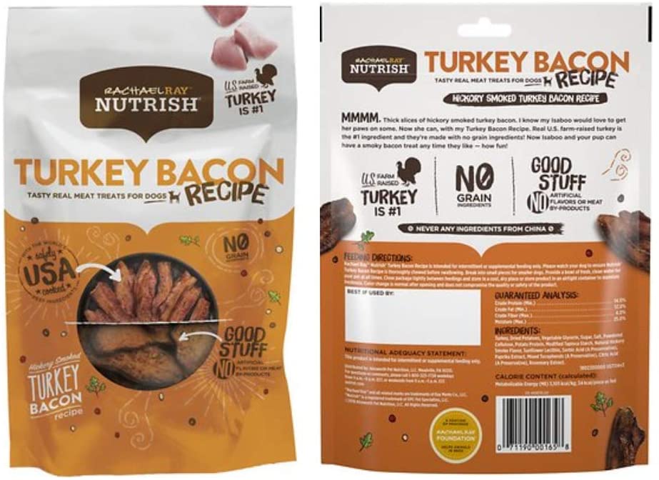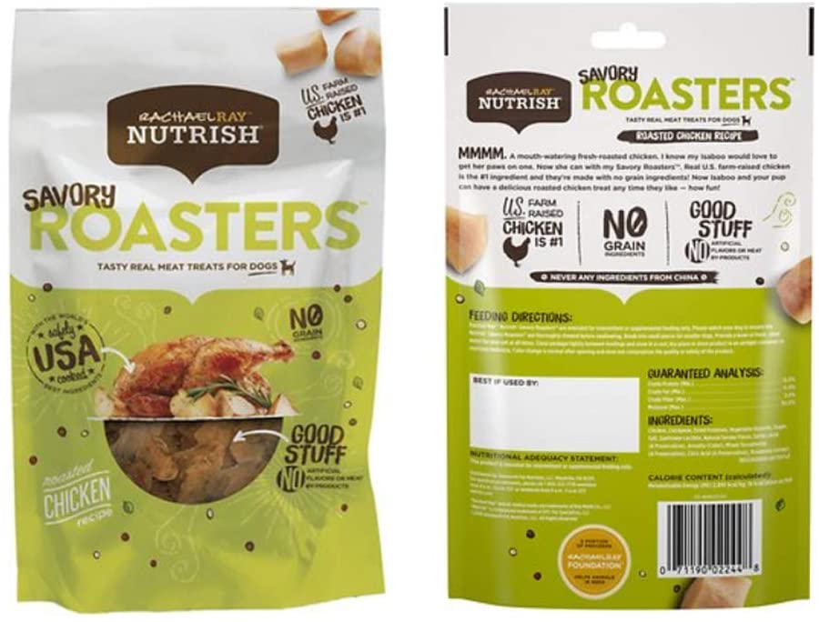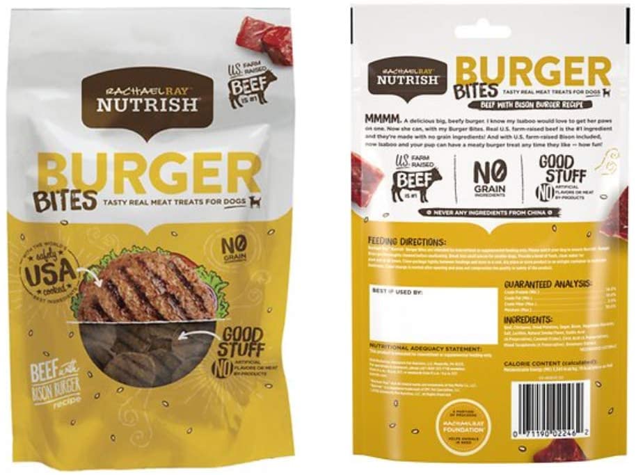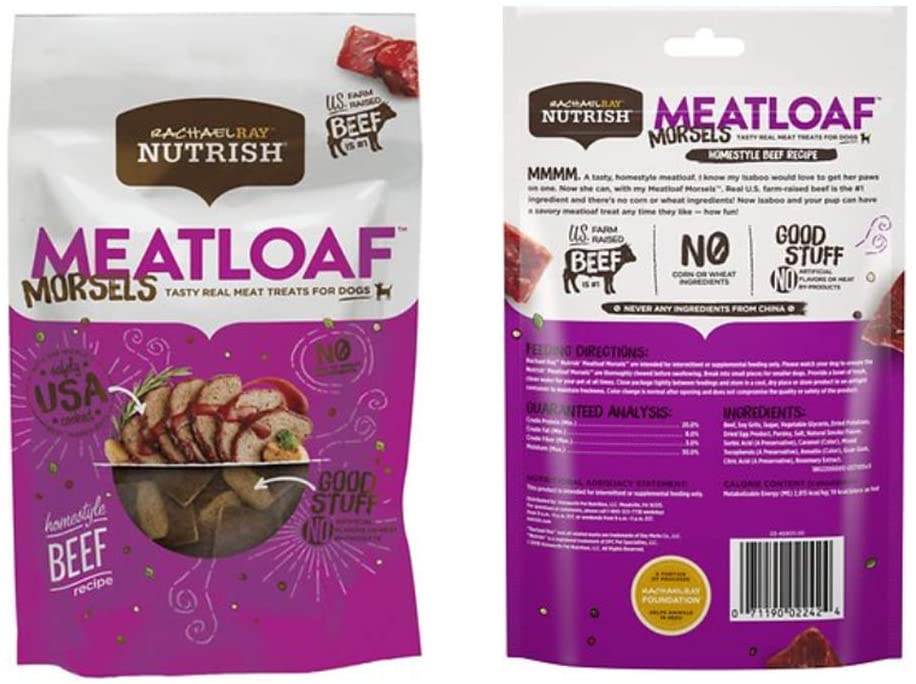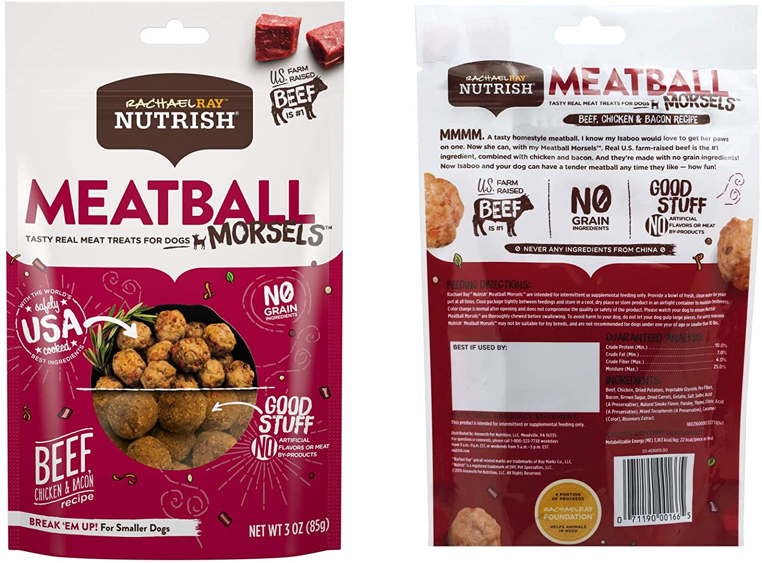 Contiene cinco (5) bolsas de golosinas para perros Rachael Ray Nutrish hechas con carne real.