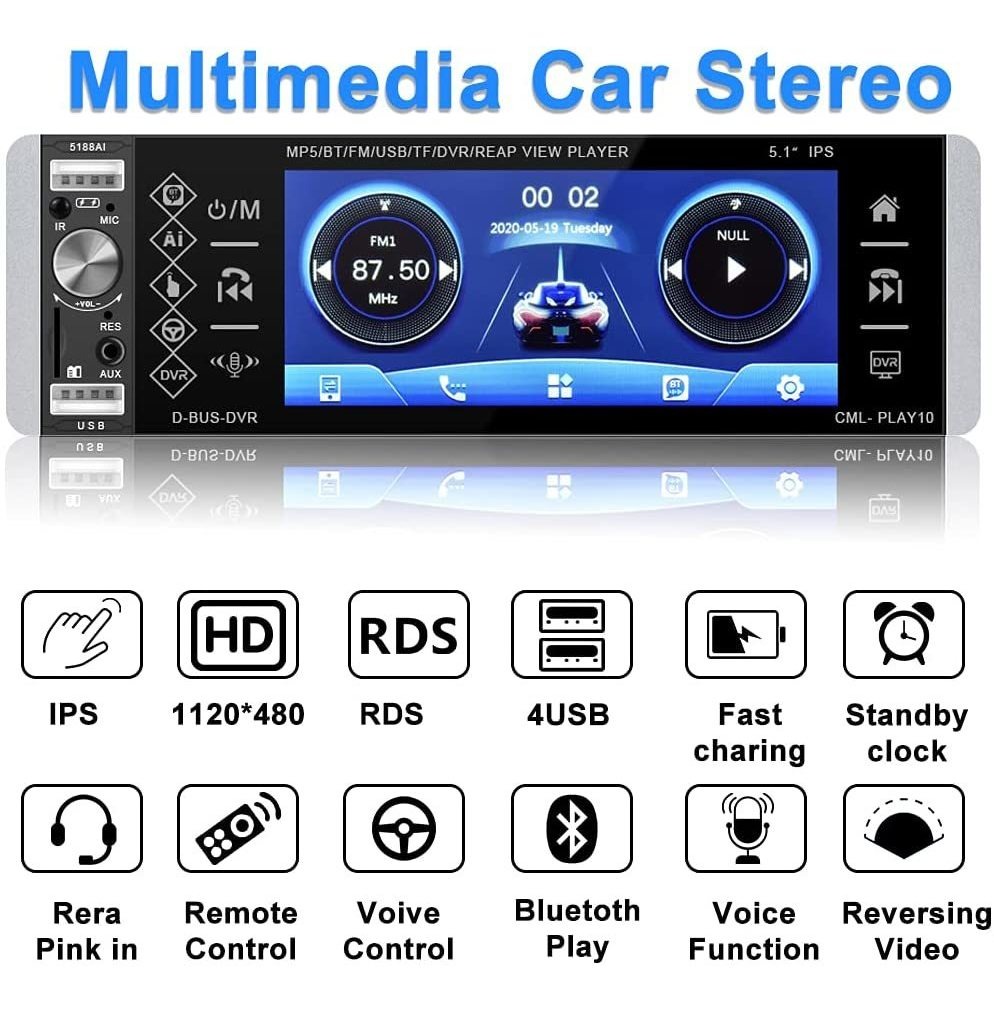 Estéreo de Coche Din Único: Pantalla Táctil Capacitiva de 5,1 pulgadas, 7,01 pulgadas (Largo) x 3,93 pulgadas (ALTO) x 2,56 pulgadas (Ancho). Hay DOS PUERTOS USB, TARJETA TF Y ENTRADA AUXILIAR, ENTRADA DE MICRÓFONO Trasero. Una variedad de efectos de sonido ecualizador; Bluetooth y FM AM RDS: Bluetooth Para Llamadas Manos Libres, Reproducción de Música, Descarga de Agendas Telefónicas. Radio FM am RDS con Estéreo de Alta Calidad, Que PedeCar Canales de Manera Totalmente Automática, Forma Semiautomática Y Ajuste Preciso; Sistema Inteligente de Control de Voz y Sonido AI Confleto compatible Siri Para Hacer Hacer Que El Coche Esté Equipado Con Función de Voz AI. TELÉFONO ANDROID A TRAVÉS DE LA INTERCONEXIÓN C-PLAY PARA HACER QUE EL COCHE ESTÉ EQUIPADO CON FUNCIONN DE VOZ AI. PULSA Y MANTÉN PULSADO LA TECLA DE FUNCIÓN DE VOZ EN LA PANTALLA O LA TECLA DE LA FUNCIONA DE VOZ EN EL MÉRNO A DISTANCIA DEL VOLANTE DURANTE 2 – 4 SEGUNDOS PARA LLAMAR AL ASISTENE DE VOZ Y PUEEDES RESOLVER RÁPIDENTAMENTE TUS Problemas. NECESIDADES: Llamada XXX, Reproducir Música, Enviar Wechat A Amigos, Subir El Volumen, etc. Entrada de Imagen de Marga Atrás y Enlade de Espejo: Viene con Cámara de Seguridad, Despuyos de Conectar Los Cables, Cuando Tires de la Marcha Atrás, El Dispositivo Mostrará La Imagen de Visión Trasera Automáticamente. (Función de Enlace Espejo para Android 4.0-7.0 y iOS 5s-7s); BOTÓN DE CONTROL REMOTO ORIGINAL DEL VOLANTE: CAMBIA RÁPIDENTAMENTE LAS FUNCIONES QUE DESEAS CON EL VOLANTE DE TU COCHE. Problema de Cualquier, Por favor Póngase en contacto con nosotros Por El Centro del Vendedor, Le ResponderEmos Dentro de 24 Horas SEATATA A LOS VEHÍCILOS: