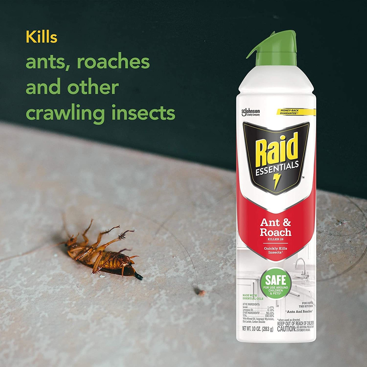 Presentamos el aerosol Raid Essentials Ant Roach que es seguro de usar en entornos donde hay niños y mascotas cuando se utiliza según las indicaciones; Raid Essentials está fabricado con aceites esenciales, y está específicamente diseñado para solo matar insectos, y es el eliminador de cucarachas a base de plantas más rápido; Hace frente a hormigas, cucarachas y otros insectos rastreros; Ideal para su uso en la cocina; la lata de aluminio no se oxida, y cuenta con una tapa de bloqueo para mayor seguridad; Práctico y continuo aerosol para hormigas y cucarachas que es fácil de usar para tu problema de insectos de forma rápida y segura Cantidad de artículos del paquete:1 | Estilo:hormigas y cucarachas