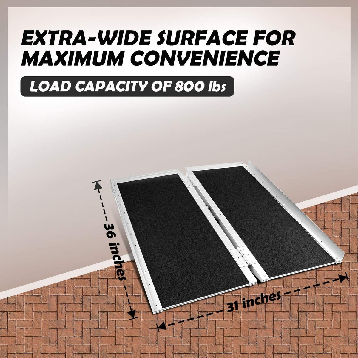 Más fuerte y más resistente que las rampas similares: esta rampa de patinete premium está hecha de aluminio grueso e inoxidable con bisagras de acero inoxidable de alta resistencia. Puede soportar cómodamente cargas de hasta 798.1 lbs.; No se desliza ni se desliza en la superficie. Te encantará el papel de lija antideslizante y antideslizante en la superficie superior de la rampa para discapacitados. Proporcionará tracción fiable en todas las condiciones climáticas, por lo que nunca te sentirás inseguro.; La superficie más amplia hace que la vida sea mucho más fácil: mide 36 x 31 pulgadas, esta rampa portátil es más amplia que la mayoría, por lo que es adecuada para casi cualquier tamaño de silla de ruedas o scooter de movilidad. Podrás subir y bajar escaleras y bordillos con facilidad.; Más fácil de guardar y empaquetar en tu coche: crear una rampa para silla de ruedas que era ultra fuerte y también extremadamente práctica era esencial. Esta rampa plegable para discapacitados es ligera y se pliega en un tamaño compacto para una máxima portabilidad.; Sabemos que te va a encantar nuestra rampa de plegado individual. Es por eso que respaldamos cada rampa con una garantía de por vida incondicional. Si se rompe o se desgasta, te enviaremos un reemplazo sin cargo adicional. Todos nuestros productos estan en inglés SKU 4022239198