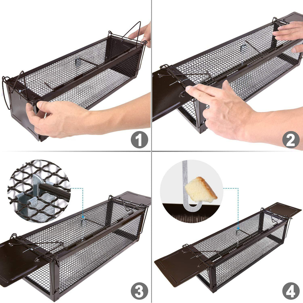 Tamaño: 17.1 x 5.1 x 5.1 in, ideal para atrapar ratones, ratas, ardillas, hámsters y otros roedores similares. Apto para interior y exterior. Diseño de doble puerta, los animales pueden entrar desde ambos lados. Es más eficaz.; Diseño: la trampa es sensible y eficaz. Podría capturar rápidamente esos animales molestos sin dañarlos o matarlos. Seguro para niños y mascotas.; Material: la trampa está hecha de alambre de hierro galvanizado. Con pintura de superficie, es duradero y resistente a la corrosión. También es fácil de limpiar y reutilizable. Después de liberar los animales capturados, se puede utilizar de nuevo.; Instalación: muy conveniente. Fácil de instalar. Solo tienes que seguir el manual de instrucciones (idioma español no garantizado). Manual de instrucciones detallado con imágenes incluidas.; Si tienes alguna pregunta o preocupación, no dudes en ponerte en contacto con nosotros. Te ofrecemos la mejor solución. Color:Marrón