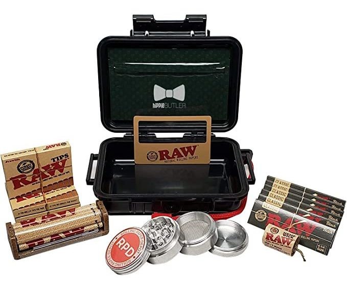 RAW – Papel de liar (6 unidades), color negro; RAW 3.110 en cigarrillos Cafetera, RAW Pre Consejos laminados; Tarjeta de Aumento RAW, RAW mecha de cáñamo; Rolling Paper Depot – Molinillo de papel (4 unidades, 1.654 in); Hippie Mayordomo – Maletín hermético y bolsa a prueba de olores, 6.5 x 4.5 pulg Hippie Mayordomo – Funda de Viaje