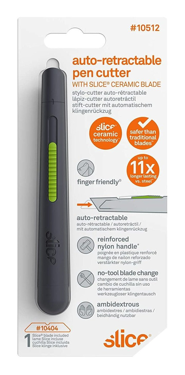 Auto-retráctil de la hoja está oculta de manera segura cuando no esté en uso (deben estar en posesión de goma deslizante botón durante el corte); Óxido de circonio hoja de cerámica con punta redondeada para la Seguridad no conductores, anti-magnético, Nunca se oxida, químicamente inerte (n) Aceite Revestimientos mantiene fuerte hasta 10 veces más largo que el acero cuchillas; 1 rebanada de cerámica de la lámina Hasta 20 hojas de metal Menos cambios de la lámina Menos lesiones menos tiempo de inactividad Menos simple No La herramienta Cambio de hoja (reemplazo SKU # 10404 o 10408); Lámina de cerámica solamente sobresale 1/2 – diseñado principalmente para el corte ondulado de embalaje, espuma, vinilo, cajas, cartón, etc; Para corte de papel y más delgadas artículos Por favor, intente la Slice 00116 Precision cortador o 00.100 de corte de seguridad o utilizar las cuchillas puntiagudas 10408 Auto-retráctil de corte y estilo de la pluma incluye una hoja de cerámica reemplazable Slice. mango patentado con el botón deslizante de goma limita la cantidad de cerámica-hoja expuesta para reducir aún más las lesiones. retrae automáticamente dentro del alojamiento para mayor seguridad cuando se suelta el botón deslizante. Patentado de alta tecnología de doble cara de la rebanada lámina de cerámica SKU número 10404 diseñado para reducir las lesiones por incorporación de un más seguro redondeado-tip. El nivel de nitidez hasta 10 veces más largo que el acero. Medidas 135 mm L x 18 mm de diámetro (5,3 en L x 0,75 de diámetro). SKU Modelo número 10512 Todos nuestros productos estan en inglés SKU 12062111747