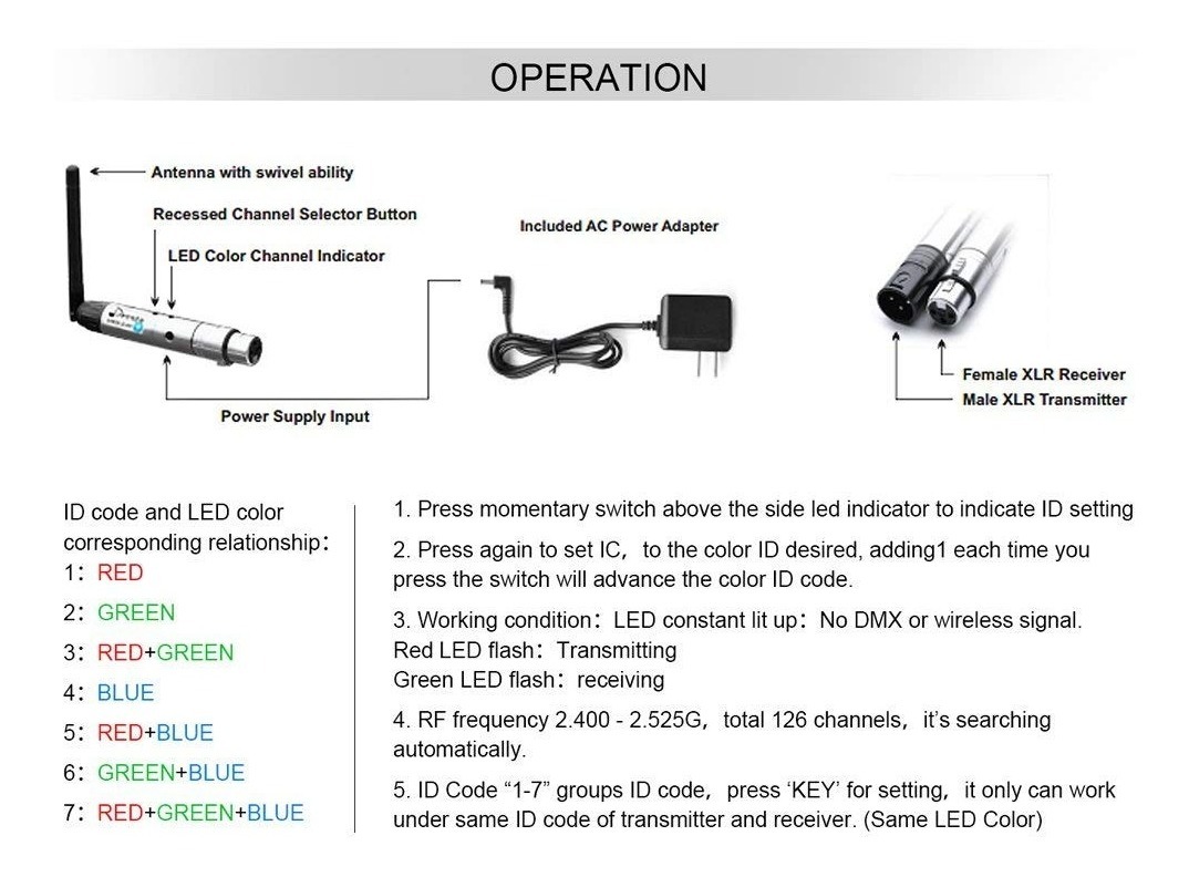 El último diseño de receptor inalámbrico DMX512 tiene una batería incorporada, no necesita adaptador de corriente más cuando funciona. 2 horas de carga a tiempo completo, 8 horas tiempo de trabajo. Los usuarios también pueden utilizar el producto durante la carga .; Shell Negro metal. Código de Identificación «1-7» grupos código de identificación, pulse ‘clave’ para el ajuste, sólo puede trabajar bajo mismo código de identificación del transmisor y el receptor. (Del mismo color LED) .; Este producto adopta una sección de frecuencia 2.4G ISM. Alta modular GFSK eficaz, la comunicación retardo de tiempo design.No cuando los datos de la señal está transmitiendo, los datos de la señal es en tiempo real y de forma fiable .; frecuencia de RF 2.400 – 2.525G.126 canales de salto de frecuencia de forma automática, de alta capacidad anti-jamming; El LED rojo parpadea cuando el transmisor transmite datos DMX por ninguna sección frecuencia interferida, sección frecuencia entonces receptor cambia comunicados. flash de hasta el mismo valor de identificador recibido corregido, flash LED más rápido una vez más rápido de datos DMX LED verde. Color: Receiverx7 (batería incorporada) y Transmitterx1