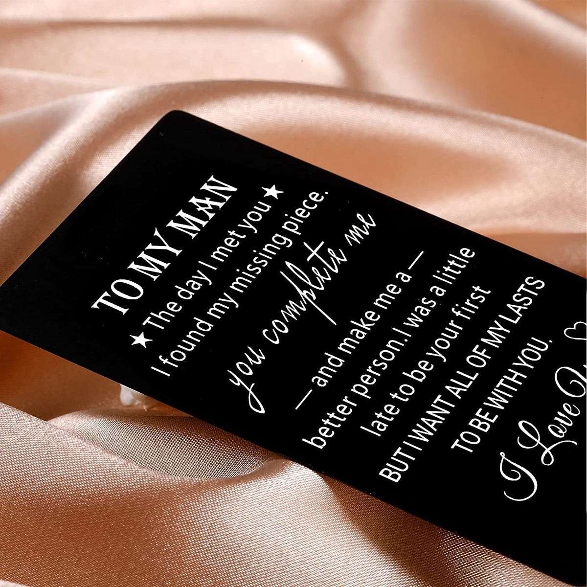 Regalos de cumpleaños para hombres: grabado con To My Man The day I met you I found my missing piece. Me completas y me hacen una persona mejor. Estaba un poco tarde para ser tu primera pero quiero que todos mis últimos estén contigo. I Love You. Perfecta para comprar esta mini tarjeta de amor para tu hombre, novio, marido, marido, novio, pareja, bebé en su cumpleaños.; Regalos de aniversario para novio marido: la tarjeta de metal es perfecta para novio, parejas, cónyuge, futuro marido, novio, prometida, recién casado de esposa, prometida, novia, novia como regalo de aniversario de fecha, regalos de aniversario de acero, 6 meses/1 año/5/10/15/20/30 aniversario de boda. Bonitos regalos para mostrar tu amor a tu alma gemela, entre otras mitades, pareja, definitivamente hace que se toquen y sonrían.; Regalo para él, la mini nota de amor es un regalo sentimental para el día de San Valentín, boda, compromiso, día del novio, día del marido, día de agradecimiento del marido, día del cónyuge, promesa, promesa o declaración, Navidad, día del padre, Acción de Gracias, Año Nuevo, Pascua, relleno de calcetín o luna de miel. Así como regalos especiales para el día más dulce, solo porque regalos, regalos de fecha nocturna, regalos de relaciones a larga distancia, regalos de despliegue. Como un pequeño recordatorio para tu ser querido.; Regalos de marido de esposa: como dulces regalos de aniversario para él, regalos de San Valentín para hombres, regalos de Pascua para novio, regalos del día del padre de novia. La tarjeta de pared de metal está hecha de acero inoxidable, no contiene plomo ni níquel, es hipoalergénica, no se oxida, cambia de color ni se deslustra. Un paquete de alta calidad con un sobre elegante y exquisito. Este artículo puede ser un poco añadido en regalo y está listo para regalar.; Servicio: prestamos gran atención a las experiencias de compra de los clientes. Tu satisfacción es nuestra motivación para seguir adelante. Haremos lo que podamos para solucionar cualquier problema y para proporcionarte el mejor servicio. Si usted tiene cualquier pregunta, nos comprometemos a responder dentro de 1 hora. Nos preocupamos profundamente por nuestros clientes y te hacemos nuestra máxima prioridad. Gracias! Estilo:To My Man
