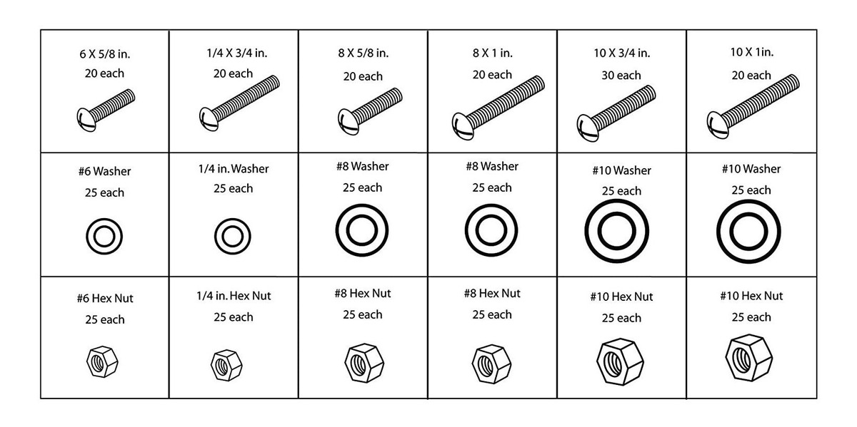 INCLUYE: 360 840 tornillos con tuercas, pernos y arandelas todos en una variedad de tamaños; Etiquetado claro: Proporciona una rápida identificación del elemento de fijación que necesita en cualquier momento; Almacenamiento conveniente: montaje en rack con mango; Contenedor de almacenamiento extra: ofrece más espacio para las herramientas que ya tiene; TAMAÑOS: Ver las imágenes incluidas en tamaños y cantidades incluidas Tamaño: W5226 1200PC tuercas y pernos Surtido
