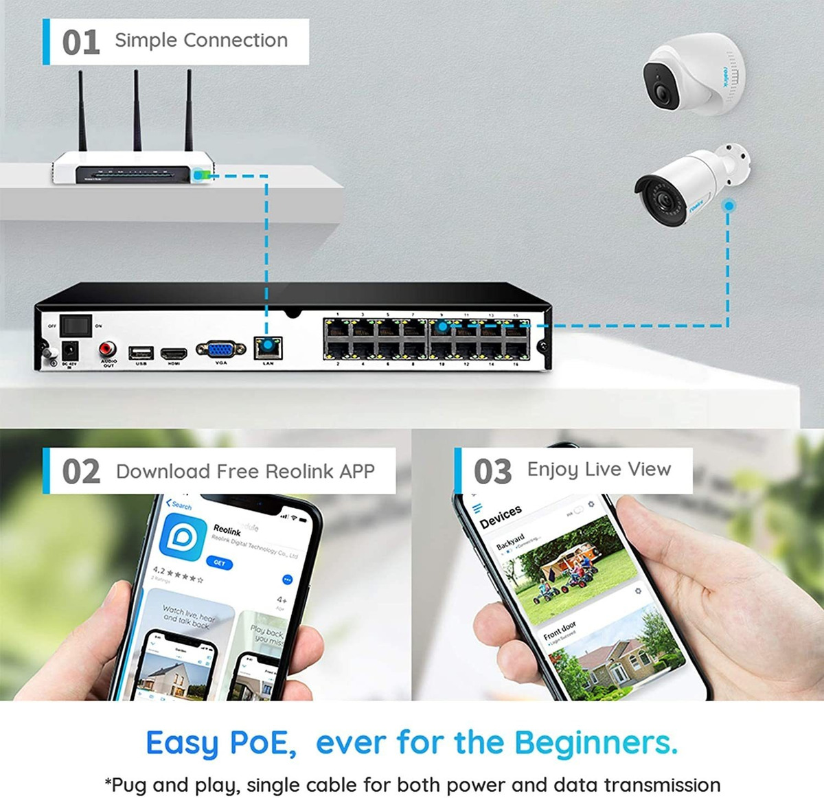 Un Sistema de Seguridad plug and play de verdad! Cuenta con PoE (Alimentación a Través de Ethernet), con cable Único de la ONU roja Que Conecta Cada Cámara IP al NVR para la Fuente de Alimentación y transmisión de Señal de vídeo. Fácil cableado: El Proceso de cableado No puede ser Más sencillo para los entusiastas del bricolaje y principiantes.