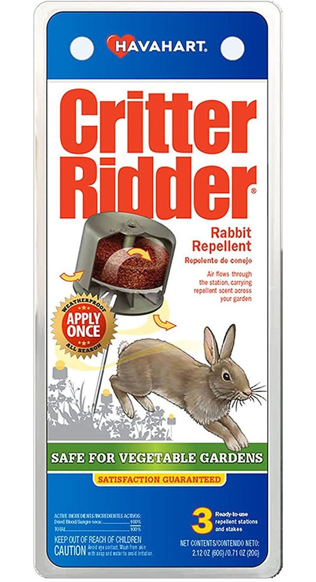 Incluye 3 x estaciones de repelente y 3 x 8.5 estacas para uso en exteriores.; Secadora sangre repelente aroma es inodoro para los seres humanos y seguro para su uso en huertos.; Diseño impermeable aplicar una vez para la protección de todo el año.; Protege hostas, ornamentales, verduras, frutas, hierbas, y otras plantas low-lying.; Satisfacción garantizada Protect your ornamental shrubs, fruit vines, and vegetable sprouts with Havaharts Critter Ridder rabbit repellent stations. Ideal for protecting up to 96 sq ft of garden space, this 3 station set provides season-long protection from foraging animal damage. Air flows through each station, carrying a repellent scent across your garden that triggers the flight response in rabbits that are likely to cause damage. Garden-safe ingredients and a weatherproof casing make this repellent perfect for edible crops and is easy to stake in mulch, tie to low hanging vines, or place in the corners of planter beds. Todos nuestros productos estan en inglés SKU 15092112662