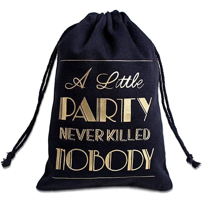 Tamaño: aprox. 5 x 7 pulgadas, un conjunto de 10. cabe en un paquete pequeño. Fácil de correo .; MATERIAL: lona de algodón, material natural, lavable, reutilizable, algodón de buena calidad, no es transparente .; DISEÑO: El color clásico. bolsas kit resaca con un cierre de cordón, hoja de oro una pequeña fiesta Nunca Nadie mató .; MOTIVO: Bachelorette fiesta, boda o cualquier parte, esta bolsa es perfecta para los kits de la resaca, perfecto para el envasado de la medicina resaca, goma de mascar, parche u otros suministros .; Estos trabajaron maravillosamente a usted y sus amigos proporcionarle algunos elementos esenciales que tanto se necesitan pequeñas y bonificaciones durante un fin de semana. De color negro