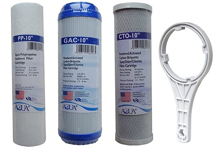 3 juego de filtros INCLUYE llave para la carcasa Estándar de carcasa de 10 x2.5 ; Tercera Etapa Tamaño de cartucho 10.:.. Premium CTO Filtro de Carbono VALORACION micras: 10 cm quitar: Compuestos Orgánicos volátiles, cloro, cloramina ,; Primera Etapa: 5 micras filtro de sedimentos para quitar las Partículas de polvo, arena, etc .; Segunda Etapa: premium GAC Filtro de carbón para quitar el cloro, mal prueba, olor La Primera Tres Etapas de Sistemas RO residenciales se Recomienda change Cada 6 meses Todos nuestros productos estan en inglés SKU 19052127285