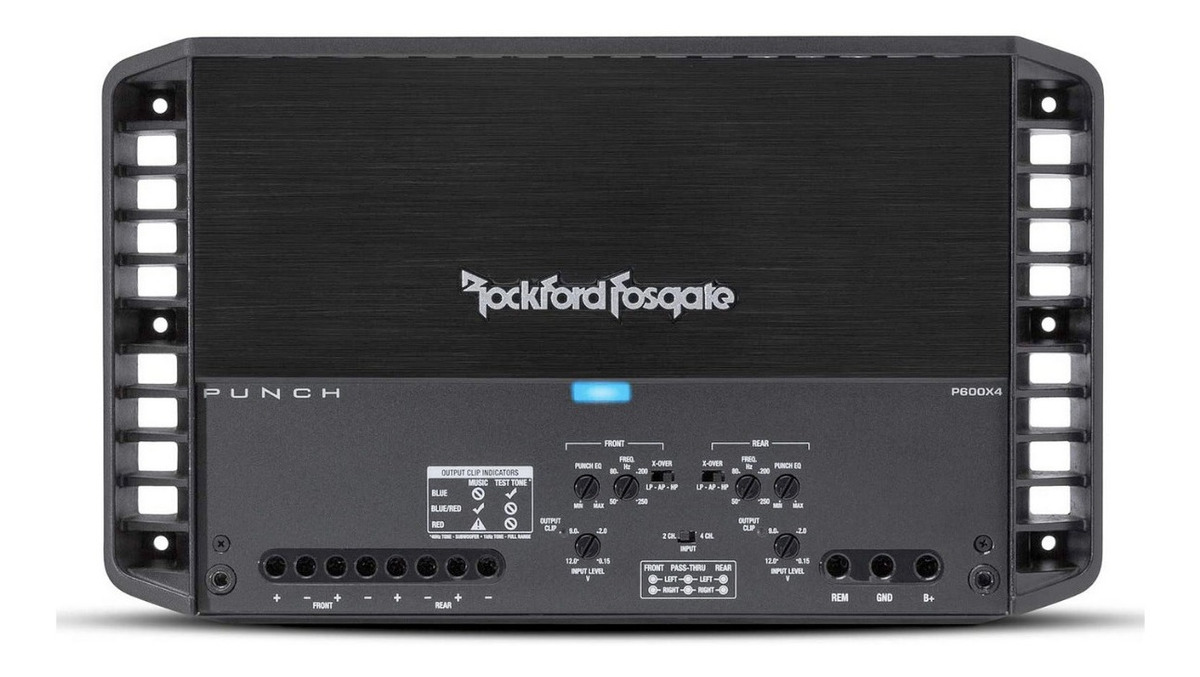 El amplificador de 4 canales Punch P600X4 de 600 W (2.4 x 7.7 x 13.3 in) es perfecto para un sistema de 4 vías de rango completo o un sistema de 3 vías que tiene un escenario frontal con subwoofers en los canales traseros.