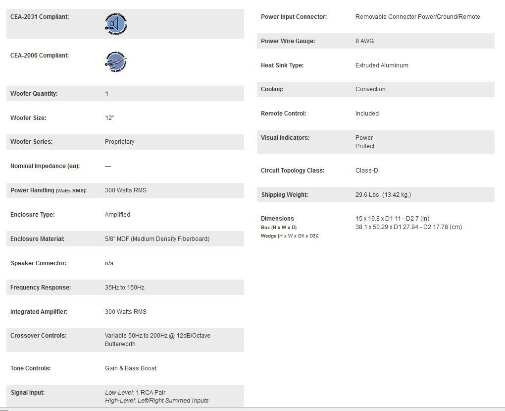 El subwoofer alimentado P300-12 es una solución «todo-en-uno» cuando se añade el bajo a un sistema de fábrica o simplemente para ahorrar espacio. Este modelo dispone de un subwoofer de 12 pulgadas en un recinto sellado accionado por un amplificador interno de 300 vatios. Adicional Filtrado Todos nuestros productos son de Estados Unidos SKU 14021800153