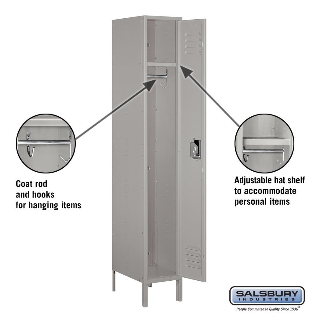 Salsbury 61000 de la serie de un solo nivel estándar de metal armarios están construidos de acero de calibre 16. Ideal para colegios, institutos, vestuarios, salas de empleados cambiar, agencias gubernamentales, gimnasios y muchas otras aplicaciones. Cuentan con un acabado duradero con recubrimiento en polvo disponibles en gris, marrón o azul. Disponible en alturas de 5 pies y 6 pies (añadir 6″ para las piernas). 5 pies de alto armarios tienen un tamaño de compartimento que es 12″ de ancho, 60″ de alto y 12″ , 15″ o 18″ de profundidad. 6 pies de alto armarios tienen un tamaño de compartimento que es 12″ de ancho, 72″ de alto y 12″ , 15″ o 18″ de profundidad. Disponible como 1 ancho o 3 unidades de ancho. Cada compartimiento armario cuenta con un estante sombrero ajustable, 3 ganchos de pared simple y un gancho doble techo (los 18″ casilleros profundas también incluyen una barra de capa); las unidades incluyen un ascensor hasta mango, cerrojo rebajada para mayor seguridad y puede acomodar combinación incorporado o cerraduras de llave y de combinación de llave o candados; Salsbury Industries es un ISO 9001: 2008 empresa certificada y se ha destacado en el campo de la fabricación desde 1936 Todos nuestros productos estan en inglés SKU 6081922808