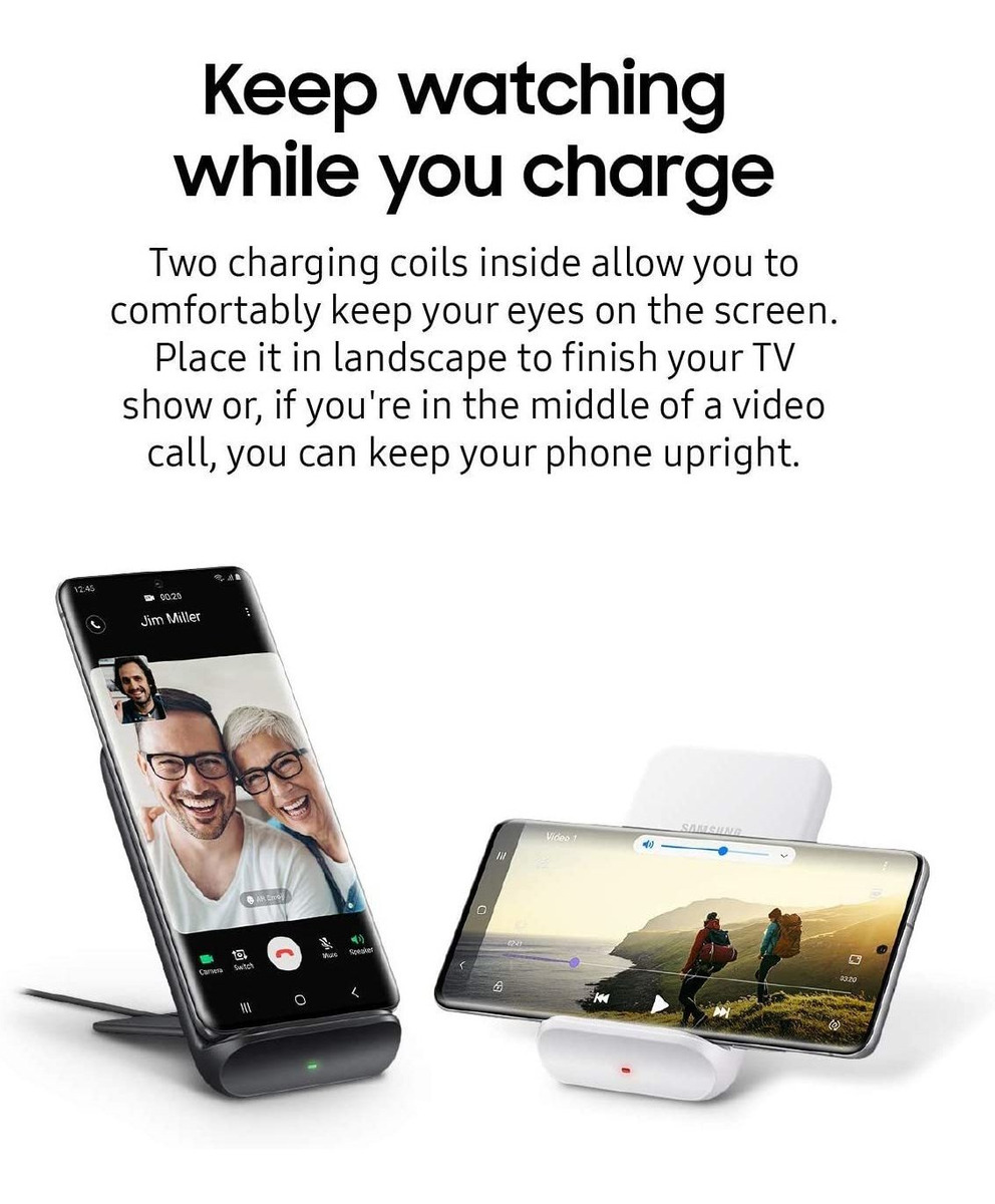 Sigue viendo mientras cargas: dos bobinas de carga en el interior te permiten mantener los ojos cómodamente en la pantalla sin cambiar la orientación. Colócalo en horizontal para terminar tu programa de televisión o, si estás en medio de una videollamada, puedes mantener tu teléfono en posición vertical.; Colócalo hacia abajo, cárgalo rápido: vuelve a tu trabajo o reproducción rápidamente con la capacidad de carga inalámbrica rápida. Aprovecha un máximo de 9 W de potencia, te ayuda a asegurarte de que no tienes que esperar demasiado tiempo para volver a tener 100% de batería.; Baja las luces por la noche: el cargador inalámbrico convertible cuenta con una luz led para indicar si tu smartphone Samsung está utilizando carga inalámbrica rápida. Cuando es hora de acostarse, puedes apagar la carga inalámbrica rápida que atenúa la luz led.; Los colores te mantienen informado: la luz led en la parte delantera te indica intuitivamente el estado de carga de tu dispositivo con diferentes colores: rojo para carga, rojo intermitente para error de carga y verde para carga completa.; Certificación Qi para una carga segura y compartir: diseñado con tecnología Qi, puedes cargar tu teléfono con una experiencia segura y fiable. Además, puedes compartir una alimentación con tus amigos y familia, o incluso otros dispositivos con certificación Qi. Con el soporte magnético desmontable, puedes elegir utilizar el cargador inalámbrico convertible como una almohadilla o un soporte. Apoya el teléfono para seguir mirando mientras carga o colócalo plano para darle un descanso. Todos nuestros productos estan en inglés SKU 91221081251