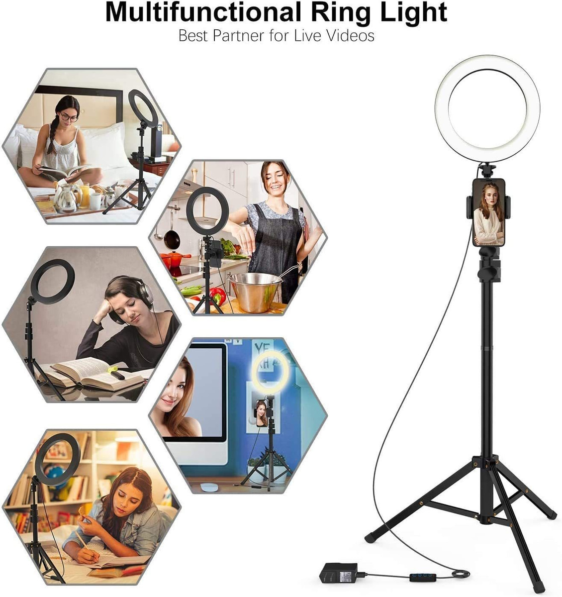 Anillo de luz regulable: 10 niveles de brillo ajustable con tres modos de color ayudan sin importar la iluminación que estés y quitar todas las sombras desfavorecedoras para resaltar la belleza del sujeto que estás fotografiando o filmando para medios de fútbol.; Soporte de luz flexible: ángulo de iluminación ajustable de 180 para la posición correcta de la fotografía para cada foto. Con tornillo de 0.2 in, también puede soportar cámaras digitales y cambios para ser un soporte de cámara.; Soporte de trípode ajustable: 4 niveles de altura extensibles de 27.5 a 47 pulgadas (la luz del anillo añade extra 9 pulgadas), versátil para trabajar como luz de computadora portátil o para estar de pie desde el suelo, te da opciones de altura de iluminación para asegurar que no hay puntos oscuros en tus fotos o vídeos.; 2 opciones de alimentación: los anillos se pueden alimentar fácilmente a través del puerto USB o con el adaptador incluido. Ya sea que estés en interiores o al aire libre para viajar, da vida a tus fotos y nunca te conformes con mala iluminación de nuevo.; Disparador remoto inalámbrico: solo tienes que conectar el mando a distancia Bluetooth con tu teléfono móvil y te ayudará a grabar fotos o vídeos desde la distancia. Perfecto para tiktoks o cualquiera que tus necesidades de vídeo puedan ser Tamaño:56 alto