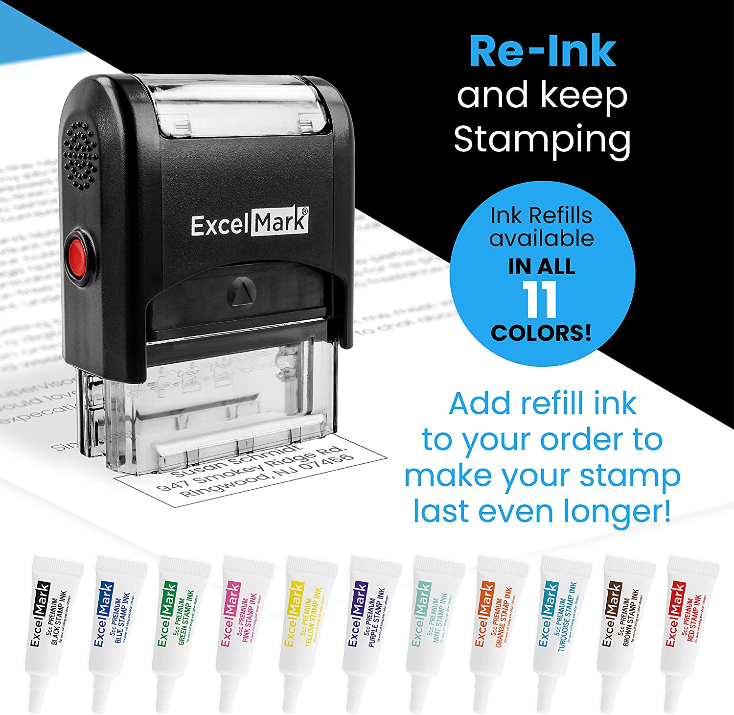 Sello autoentintable personalizado – Hasta 3 líneas – 11 opciones de color y 17 opciones de fuente