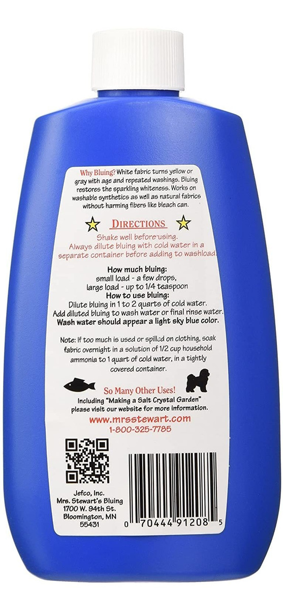 Nuevo Enfoque de Calorías Cargado frontal Para Ayudar Con La saciación y Evitar el atasco o el fracaso del Programa DEBIDO al hambre .; Creado en Colaboración con naturopático Un medico con licencia .; Diseñado para mantener Aquellos Que DeSean ONU Estilo de Vida Saludable .; Certificado por el USDA: Proyecto orgánico y sen OMG, certificado Kosher, lácteos, soja y sin gluten .; Sin edulcorantes artificiales: Nuestros edulcorantes Orgánicos SE DERIVAN Estrictamente de los jugos exprimidos frescos de Nuestras Frutas y Verduras Orgánicas. Sin edulcorantes añadidos en Nuestros Productos. Blanquear los blancos con la ayuda de la señora Stewart líquido azulado concentrado. Este producto mejora el brillo de las telas blancas mediante la adición de un pigmento azul que contrarresta el amarillamiento natural que se produce durante el lavado regular. También se puede utilizar para oscurecer los pantalones vaqueros y tela azul oscuro otra. Este azulado líquido para ropa se puede utilizar para materiales sintéticos y naturales sin dañar las fibras, a diferencia de la lejía de costumbre. Otras aplicaciones incluyen vidrio y cristal de limpieza, azulado piscinas, para blanquear el cabello y las mascotas y más. Es no tóxico y biodegradable. bluing tela de la señora Stewart se vende como un paquete de 12 (con 8 oz por botella). Todos nuestros productos estan en inglés SKU 8112000513