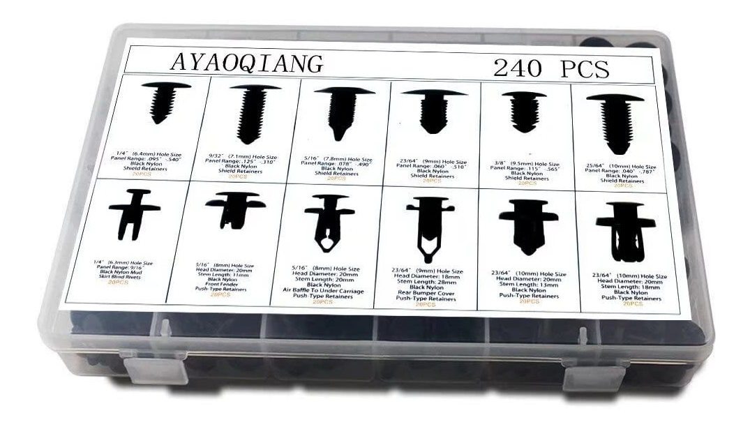 Ahorra tiempo, frustración y dinero. No hay necesidad de ir a una tienda de herramientas para vehículos y buscar diferentes tornillos. Los tenemos en una caja para lo que necesites.; Permanece organizado. La caja de 12 compartimentos es de fácil lectura con una lista completa de piezas, tamaños y cantidades.; Removedor de tornillos gratuito. Mango de acero inoxidable y mango práctico para la eliminación segura de clips de metal o plástico.; Los 12 tamaños más comunes. Cubre 0.24 in a 0.39 in de tamaños de orificio para el repuesto exacto OEM de sujeciones averiadas.; – Todos nuestros productos estan en inglés SKU 4022203001