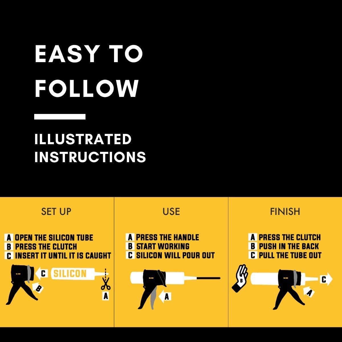 La pistola para calafatear más compacta y ligera, con un diseño antigoteo y ligero patentado para masilla y silicona, de alto rendimiento, hecha del plástico ABS muy resistente, fácil de sostener y que se adapta a cualquier caja de herramientas. Largo total: 4 pulgadas (sí, solo 4 pulgadas). Peso: 10.4 onzas.; La pistola con funciones antigoteo incorporadas se puede utilizar con todos los cartuchos de 10 onzas y paquetes de salchichas de 10.5 onzas líquidas. Se puede utilizar con masillas de látex, acrílicas, de silicona y compuestos similares.; Ideal para espacios reducidos y ángulos difíciles: la corta longitud de la pistola SILIGUN y la posibilidad de retirar el exceso del tubo de silicona te permiten llegar incluso a los lugares más estrechos, como por ejemplo, detrás del inodoro. Si puedes meter la mano, puedes trabajar con la pistola para calafatear SILIGUN.; Fácil de cargar: se carga y se retira en cuestión de segundos. Te garantizamos un trabajo limpio gracias a la tecnología antigoteo. Incluye instrucciones (idioma español no garantizado). La limpieza es muy fácil.; Excelente potencia de flujo: la alta relación de empuje de 12:1 proporciona un flujo de adhesivo grueso y distribuye la masilla de forma más eficiente. – Todos nuestros productos estan en inglés SKU 91221001734